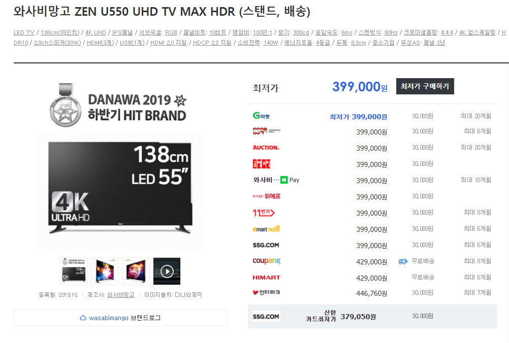 오늘 리뷰 할 제품은 와사비망고에서 나온 IPS 55인치 4K TV입니다.
