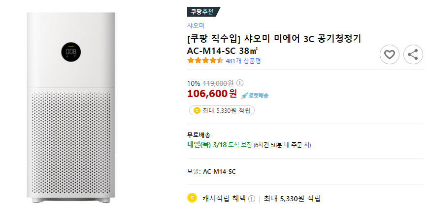 샤오미 공기청정기를 구매하기로 마음 먹었다면 쿠팡에서 구매하시는 것이 다른 판매처 보다는 좀 더 낫습니다.