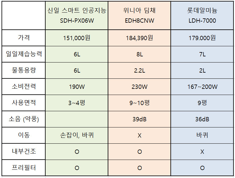 가격, 소비전력, 제습능력은 항상 비례합니다.