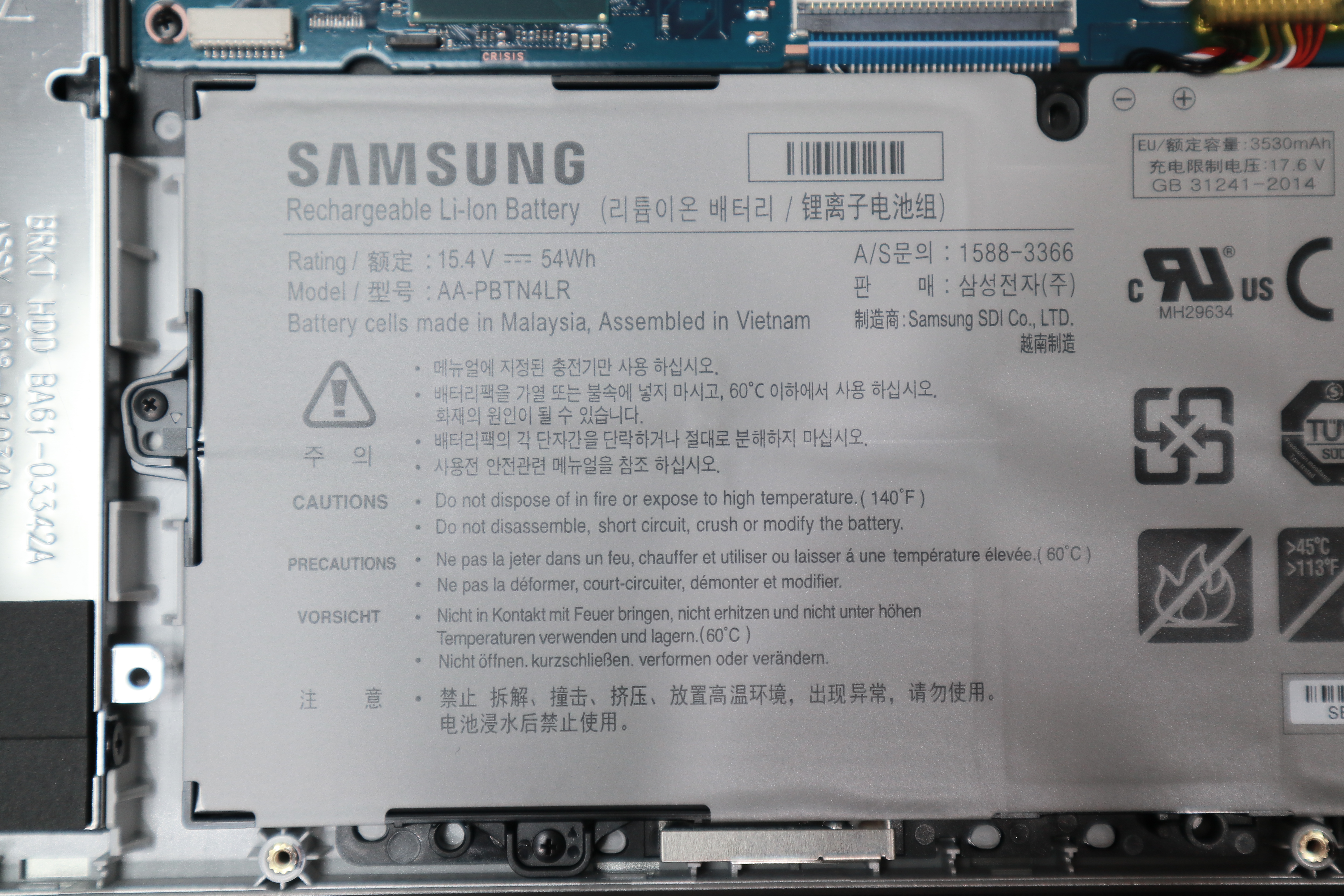 저전력 노트북들과 다르게 고성능 노트북은 전력 효율이 좋지 못해 배터리에는 많은 신경을 쓰지 않아요. 배터리용량이 작아도 오래 못쓰고, 커도 오래 못쓰니 차라리 무게와 단가라도 줄이기 위해 이정도 용량을 사용하죠. 요즘은 2kg대의 90Wh 정도 들어가는 노트북들이 나오고 있긴 하지만, 고성능 노트북을 데일리 휴대용으로 가능한지에 대한 부분은 개개인 마다 다르겠죠. 여기 54Wh라고 적혀 있습니다.
