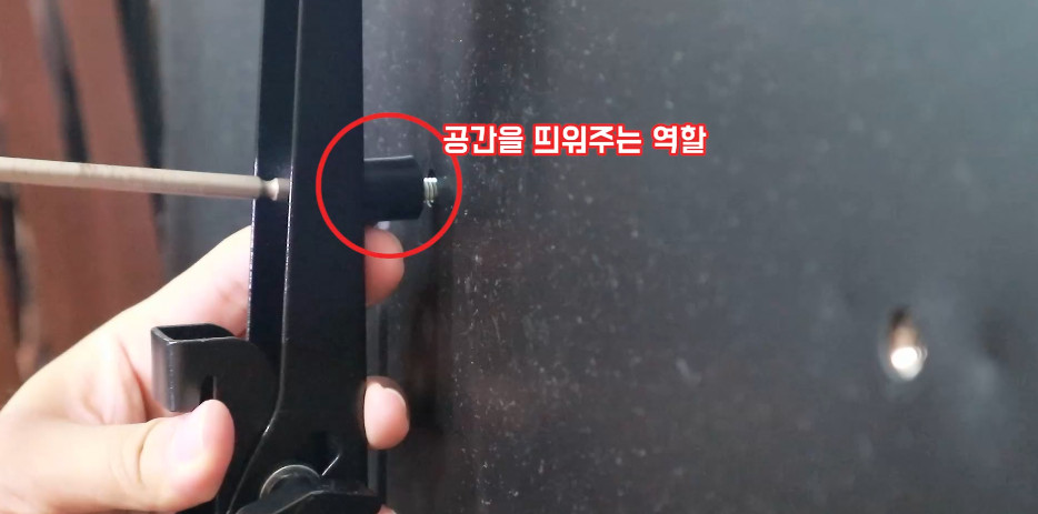 이 나사를 조여줌으로써 TV가 완벽히 브라켓에 결착이 된거죠.