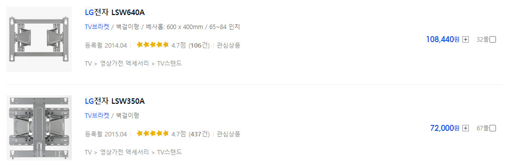 50kg 정도의 하중을 버틸 수 있는 LG 정품 브라켓이 10만 원 대로 비싼 편에 속하고
