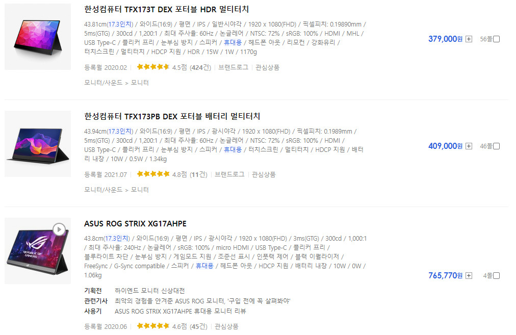 다나와에서 17.3인치 휴대용 모니터를 검색해보면