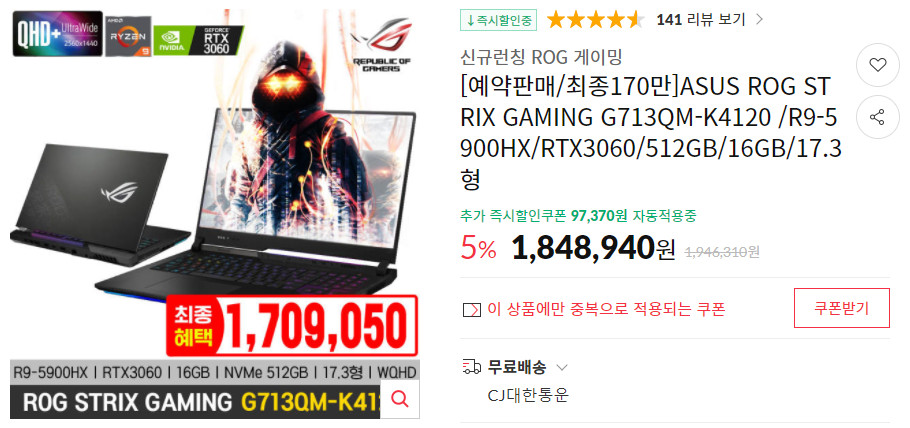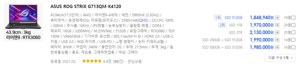 ROG 스트릭스는 5900HX, RTX 3060, 17.3인치 FullHD 보급형 패널