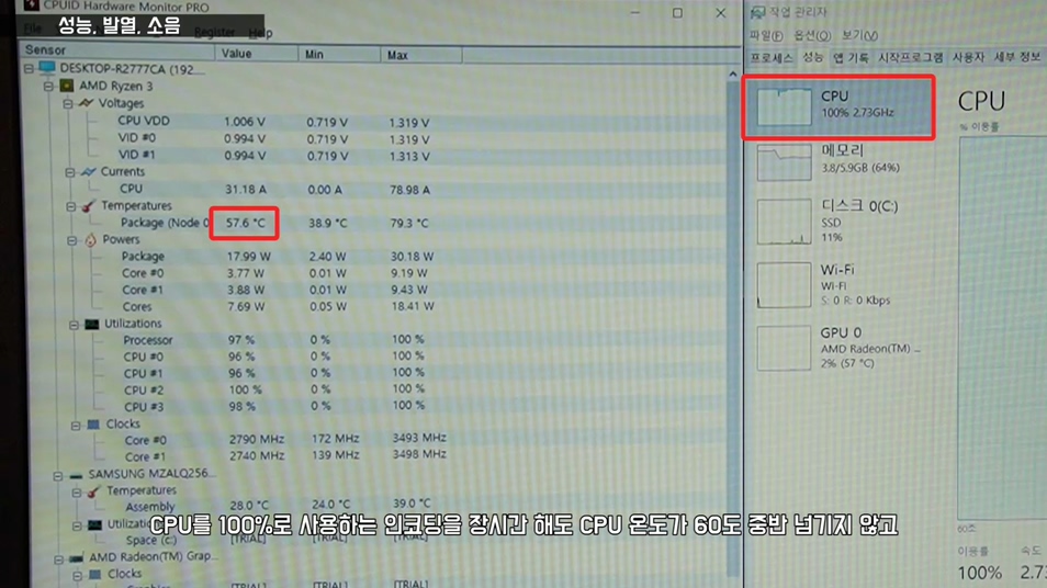 CPU를 100%로 사용하는 인코딩을 장시간 해도 CPU 온도가 60도 중반 넘기지 않고