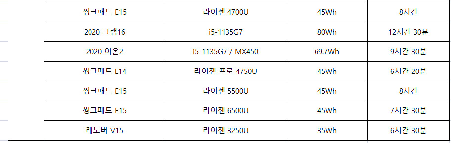 배터리 용량 대비 수치가 잘 나왔어요.그런데 이정도 시간이 나오면 실제 사무 작업에서 5시간은 나와줘야 하는데,