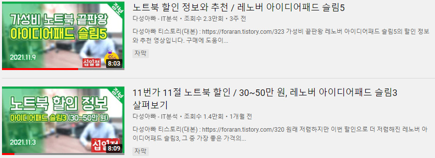 실제로 사용 중인 가성비 좋은 IT 제품들을 추천드립니다 / 다성아빠's 데스크셋업 (5) 2022.02.28 2021년 12월 노트북 추천 (2) 2021.12.12 몇 인치 노트북이 가장 좋을까? / 초보자들을 위한 노트북 구매가이드 (1) 2021.12.08 가장 좋은 게이밍 노트북 2대 비교 추천 / 레노버 리전5 프로 / Asus ROG 스트릭스 (3) 2021.12.02 레노버 리전5 Pro 끝장리뷰 / LEGION 5 Pro 16ACH R7 STORM (17) 2021.11.18 가성비 좋은 360도 액정 회전형 2in1 노트북 추천 (0) 2021.11.11 60만 원에 구매할 수 있는 "옵션 좋은 가성비 노트북" (5) 2021.11.10