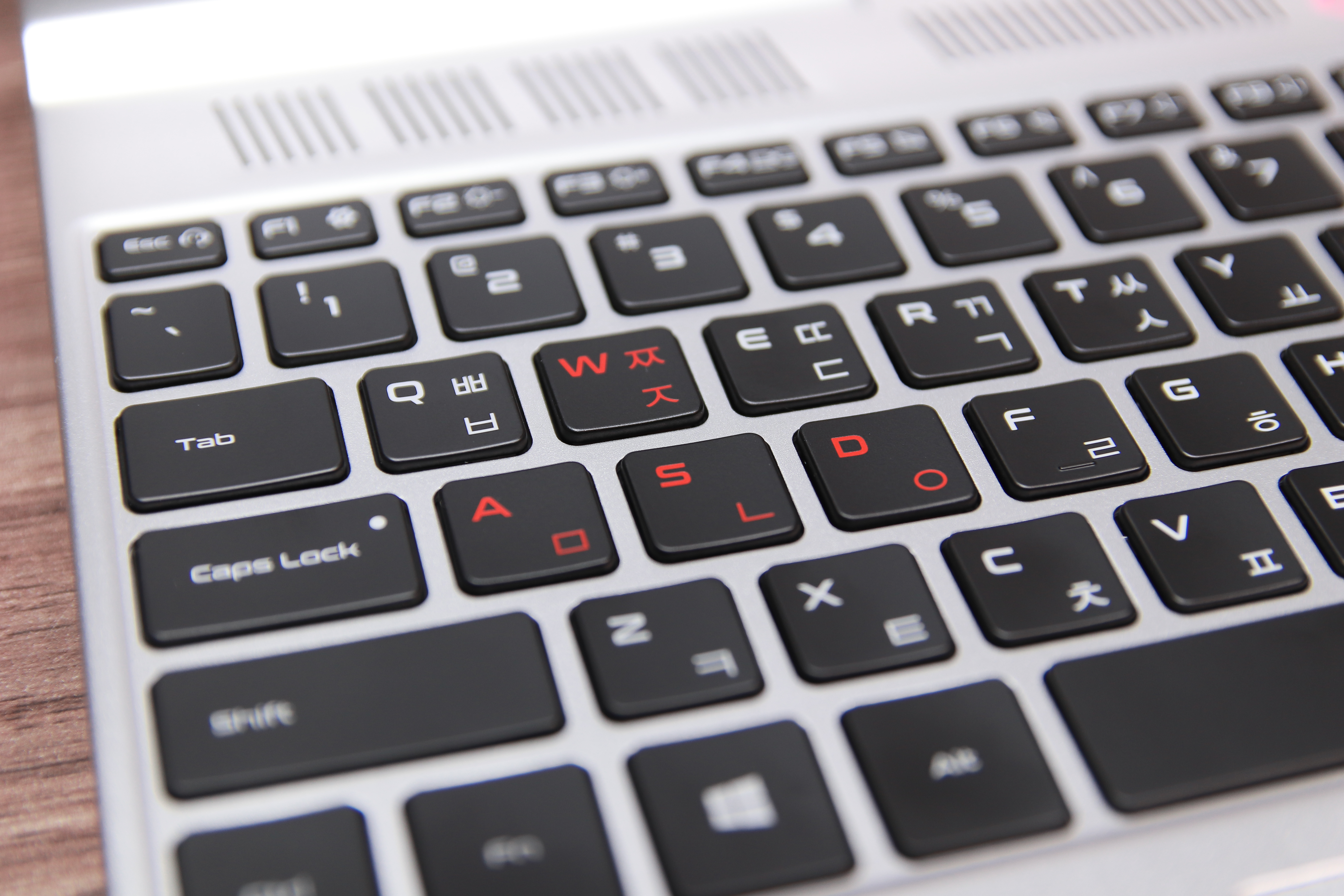 알루미늄 바디로 본체가 안정적으로 튼튼하게 받쳐주며 키감과 반발력이 굉장히 소프트 합니다. 게이밍 노트북에 어울리는 기계적인 느낌은 전혀 없이 굉장히 부드러운 키감을 가졌습니다. 그리고 키 캡 사이의 간격이 넓어서 타이핑용으로 사용할 때 오타율이 낮습니다. 노트북의 가로 사이즈를 최대한 활용한 풀사이즈 키보드로 누구나 만족할 수 있는 키보드입니다.