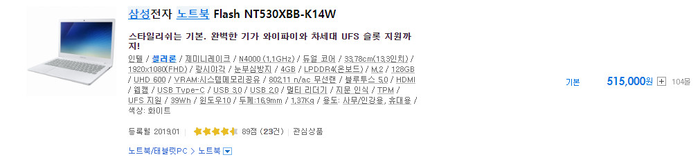 2019년 나온 보급형 라인 중에서 1.4kg 정도의 가벼운 모델도 물론 있습니다. 보급형에서 50만원이면 꽤 비싼 노트북이죠. 근데 N4000의 제미니레이크가 들어있어요. 못쓸정도로 사양이 낮은 CPU에요. 셀러론 3865U도 느려서 버벅이는데 N4000을 넣었습니다. 진짜 50만원 대 노트북에 제니미레이크 넣는 제조사는 삼성밖에 없을 거예요. 정말 말도 안되는 노트북이에요. 또 보급형 종류는 엄청 많아서 초보자들을 힘들게 합니다. 삼성이나 LG의 보급형 노트북을 구매하시려면 시야를 많이 넓히셔야 돼요.