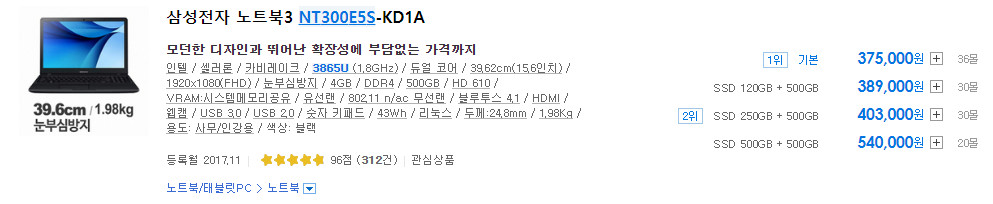가성비가 좋지 못한 삼성에서 40만원 미만에 구매할 수 있는 15.6인치 노트북입니다. "40만원 미만에 구매할 수 있는 삼성 노트북" 이라는 타이틀은 굉장히 중요합니다. 사실 노트북을 어느정도 볼 줄 아는 사람이라면 이 노트북이 얼마나 시대를 역행하는 말도 안되는 노트북인지 잘 아실 겁니다. 그럼에도 불구하고 모든 삼성,LG 노트북이 그렇듯 생각보다 판매율이 높습니다. "삼성 노트북"의 타이틀은 적어도 우리나라에서 절대 무시못하죠. 가격과 성능 보다 브랜드 네임에서 오는 안정감과 완벽한 AS망을 원하는 고객층이 많이 있습니다.