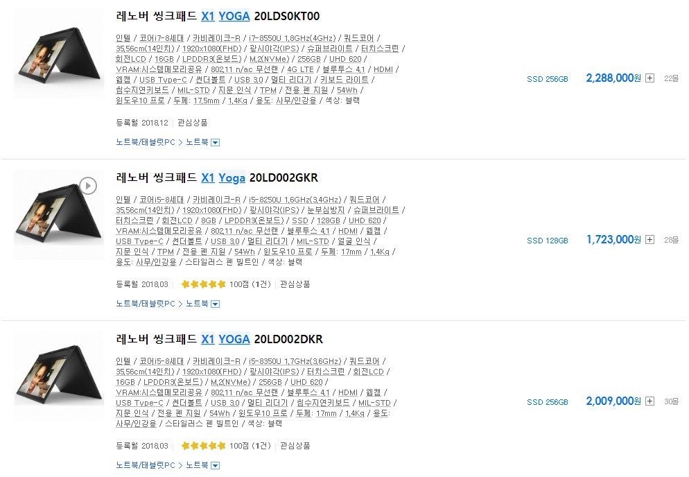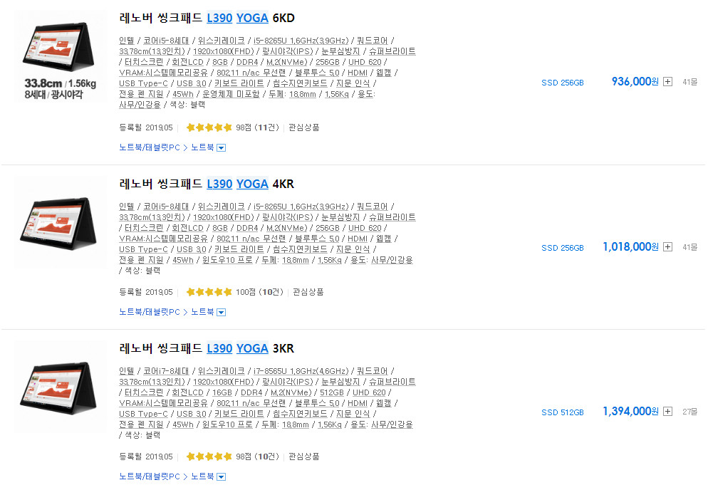 더 상급 라인으로 X1 요가가 있지만 X1요가는 거의 200만원 부터 가격이 시작하는 프리미엄급 노트북인 반면 L390 요가제품은 100만원 정도로 구매 가능합니다. 제가 구매한 제품은 13.3인치에 i5-8265U 용량은 256GB, 램은 8GB입니다.