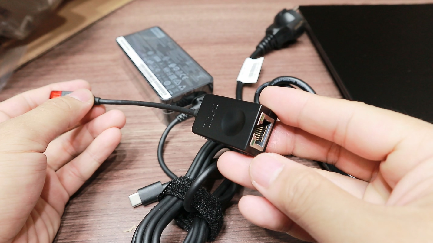 일반 다른 노트북에서 볼 수 없는 구성품이 들어있네요. 이더넷 아답터라고 일반 유선랜을 활용하기 위한 아답터인데 특수한 규격이라서 다른 노트북에서는 사용이 불가능합니다. 빠르고 안정적인 유선 인터넷 속도를 위해 자체규격을 넣은 듯 한데 타입C단자로 지원하는 범용성 높은 아답터를 줬으면 어땟을까 하는 아쉬움이 있습니다. 물론 비즈니스 사무용 노트북을 지향하는 싱크패드 특성상 이 전용 단자를 선호하는 유저분들이 있을 거라 생각합니다.