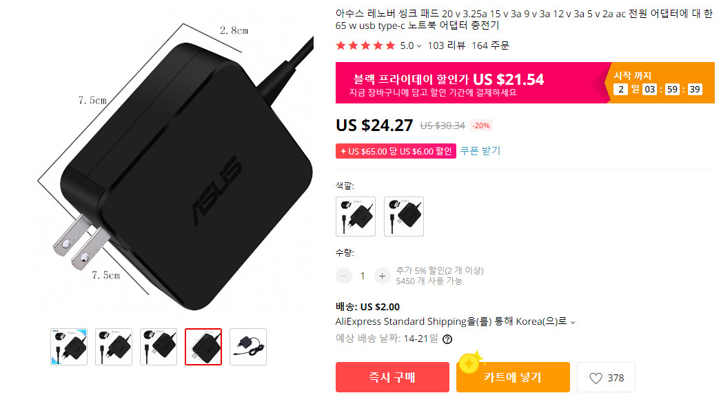 저같은 경우는 다른 리뷰에서도 말씀 드린 적 있지만 알리에서 Asus 타입C 정품 충전기를 저렴하게 구매했고 국내에 65W 규격의 충전기는 이보다 2배 정도 비싼 가격에 판매되고 있습니다.