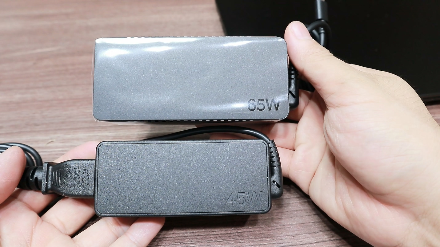 65W의 C타입 단자로 되어있는 고용량 아답터가 기본 제공됩니다. 45W 아답터와 크기를 비교하면 이정도 이고 실제로 좀 더 무겁기도 합니다. 아답터를 계속 휴대해야 된다면 조금 부담될 수 있는 무게와 크기라고 생각되고