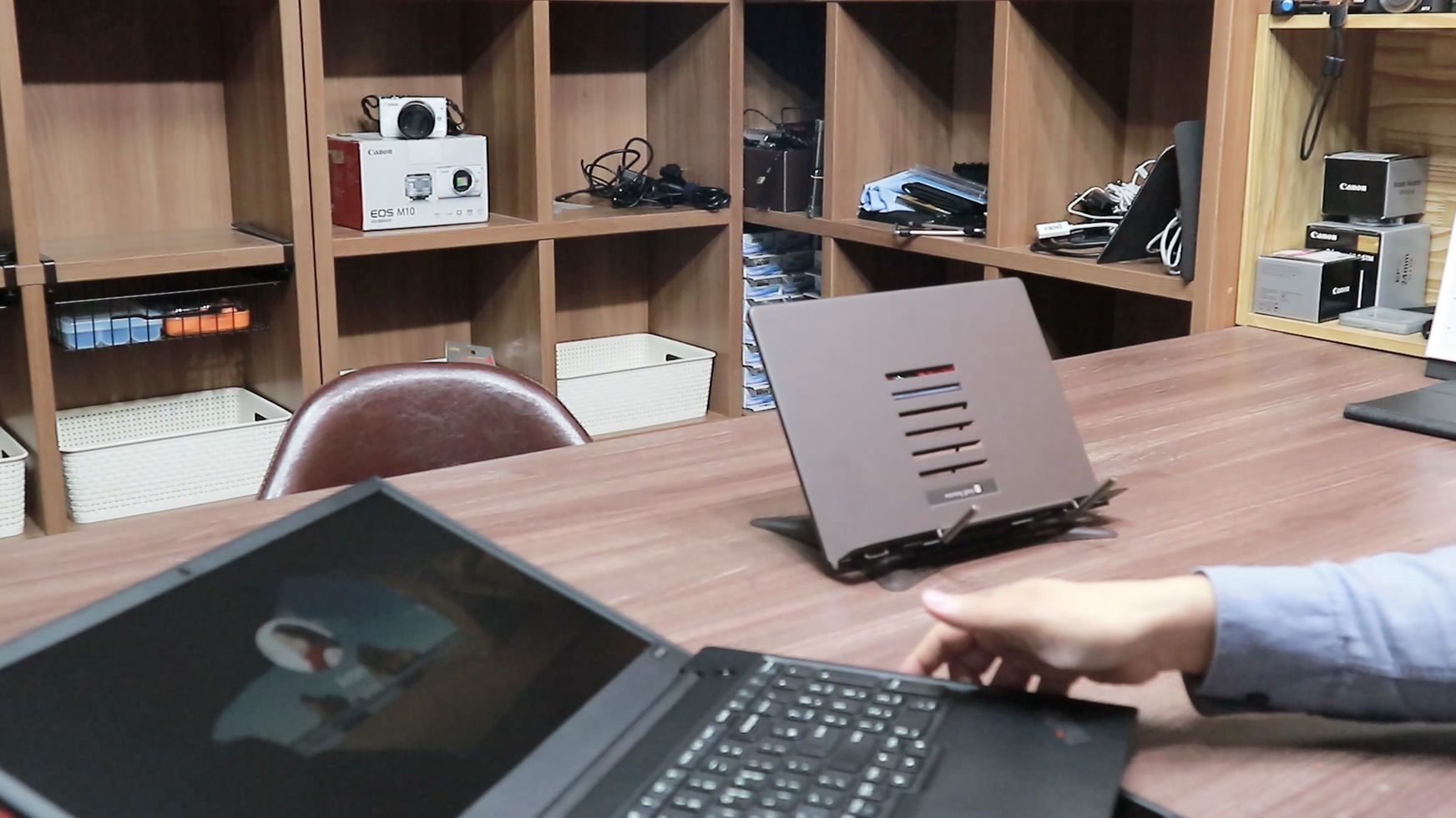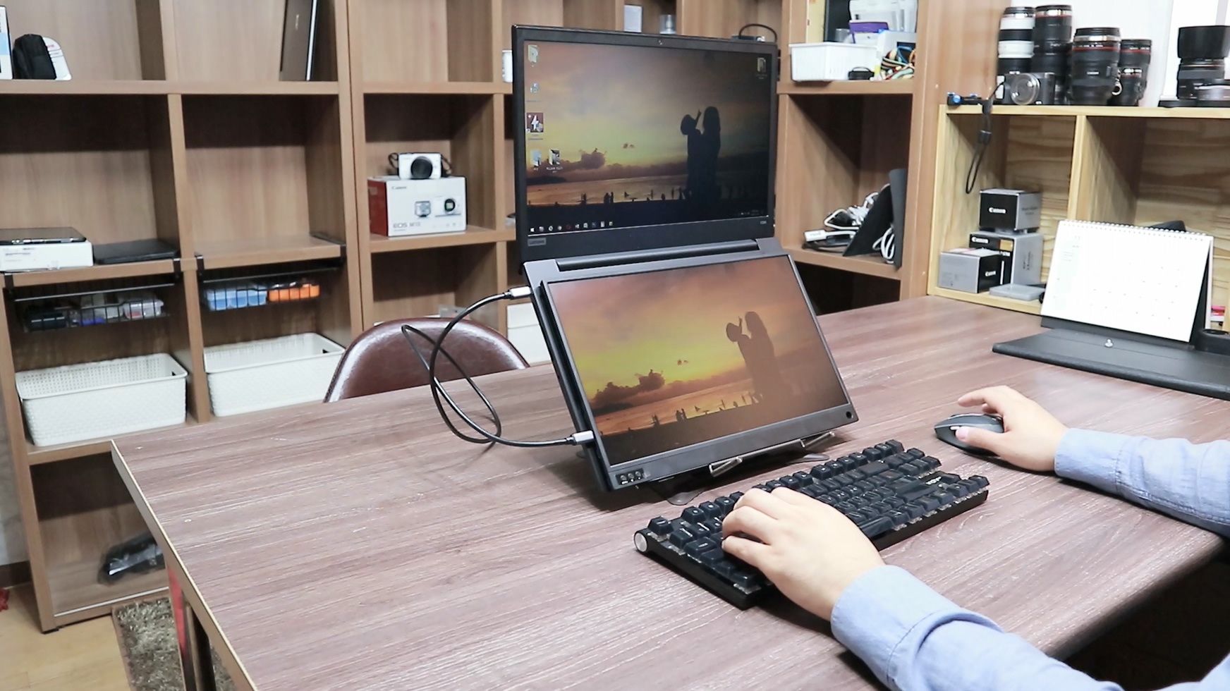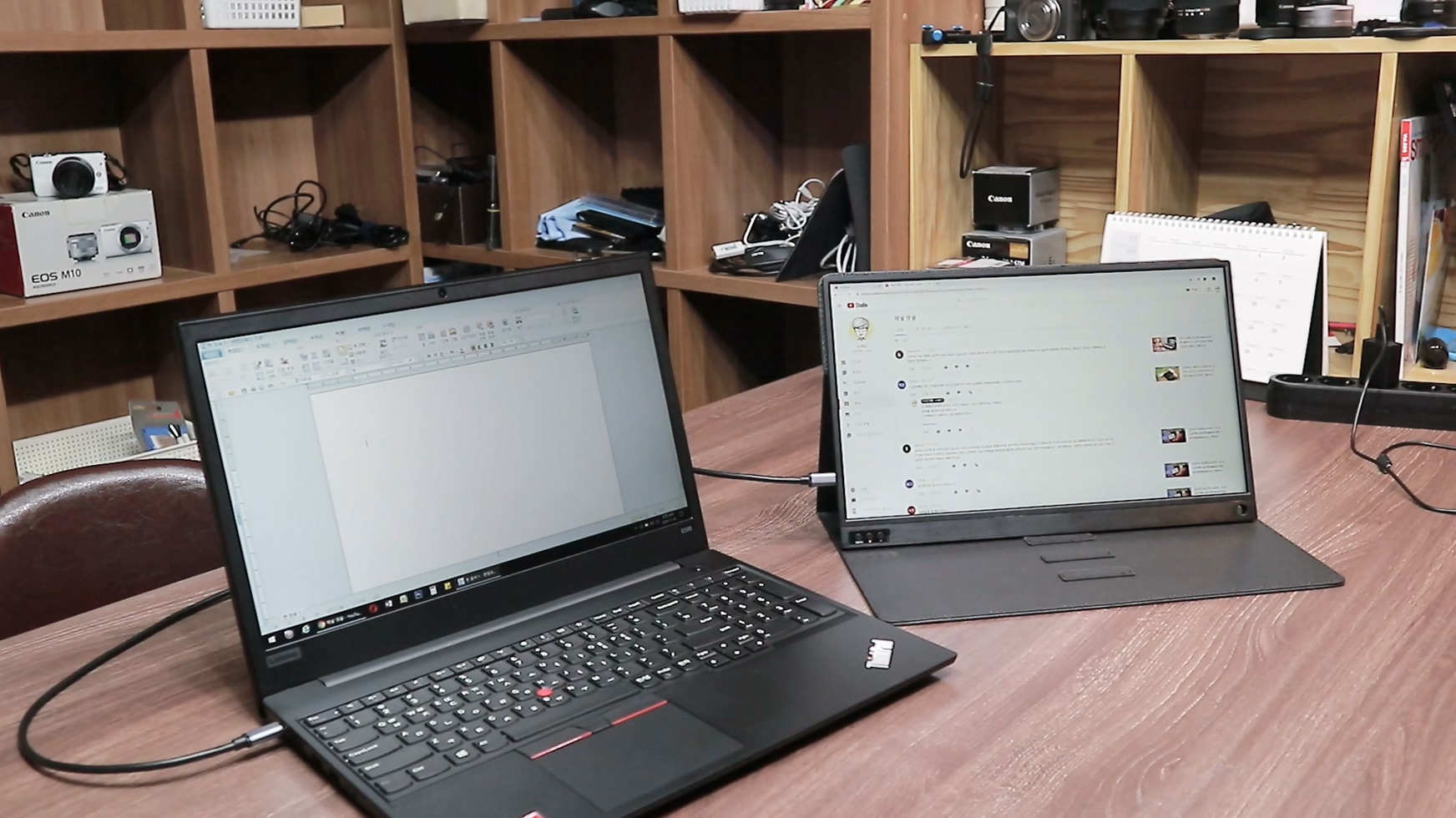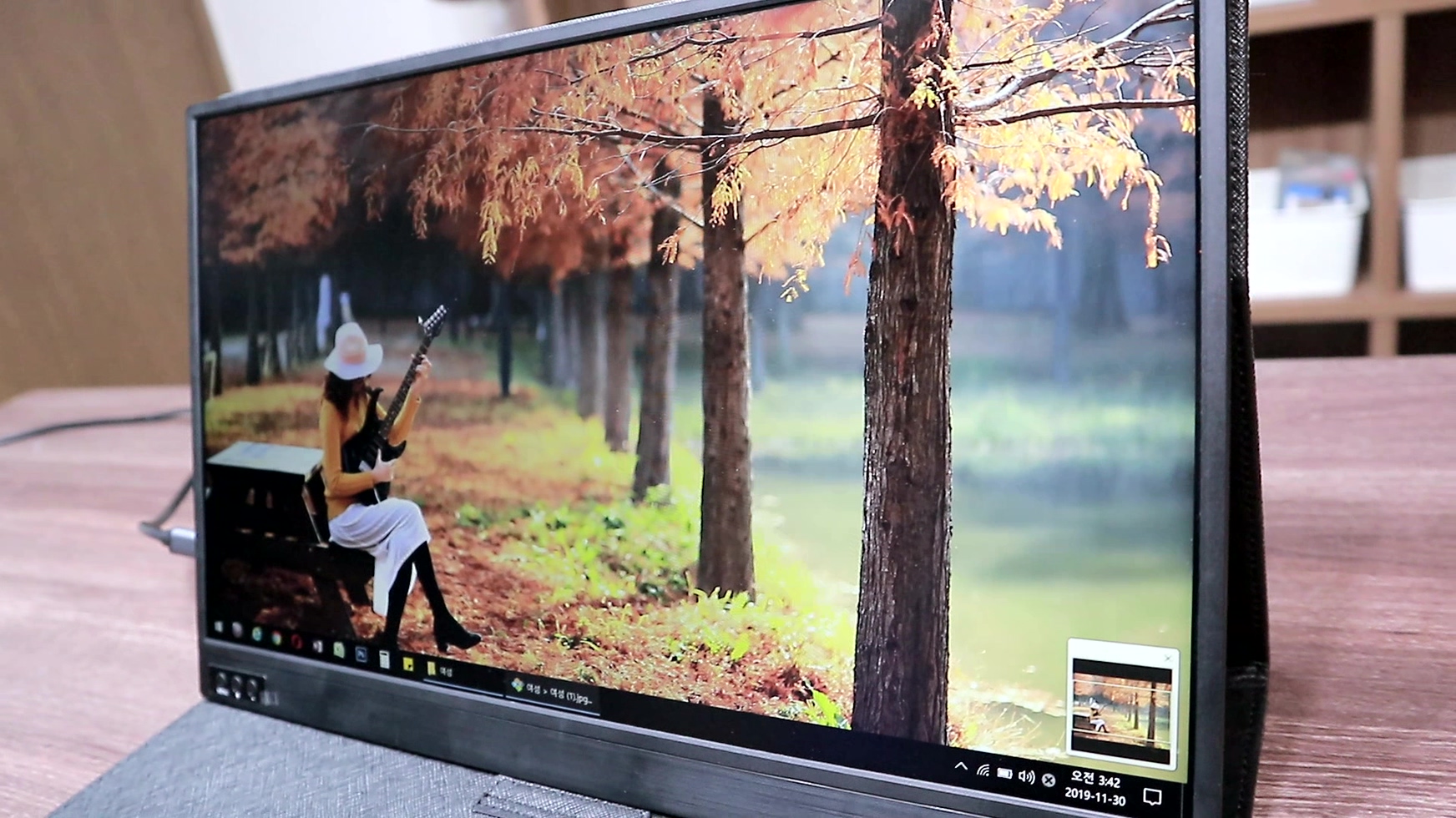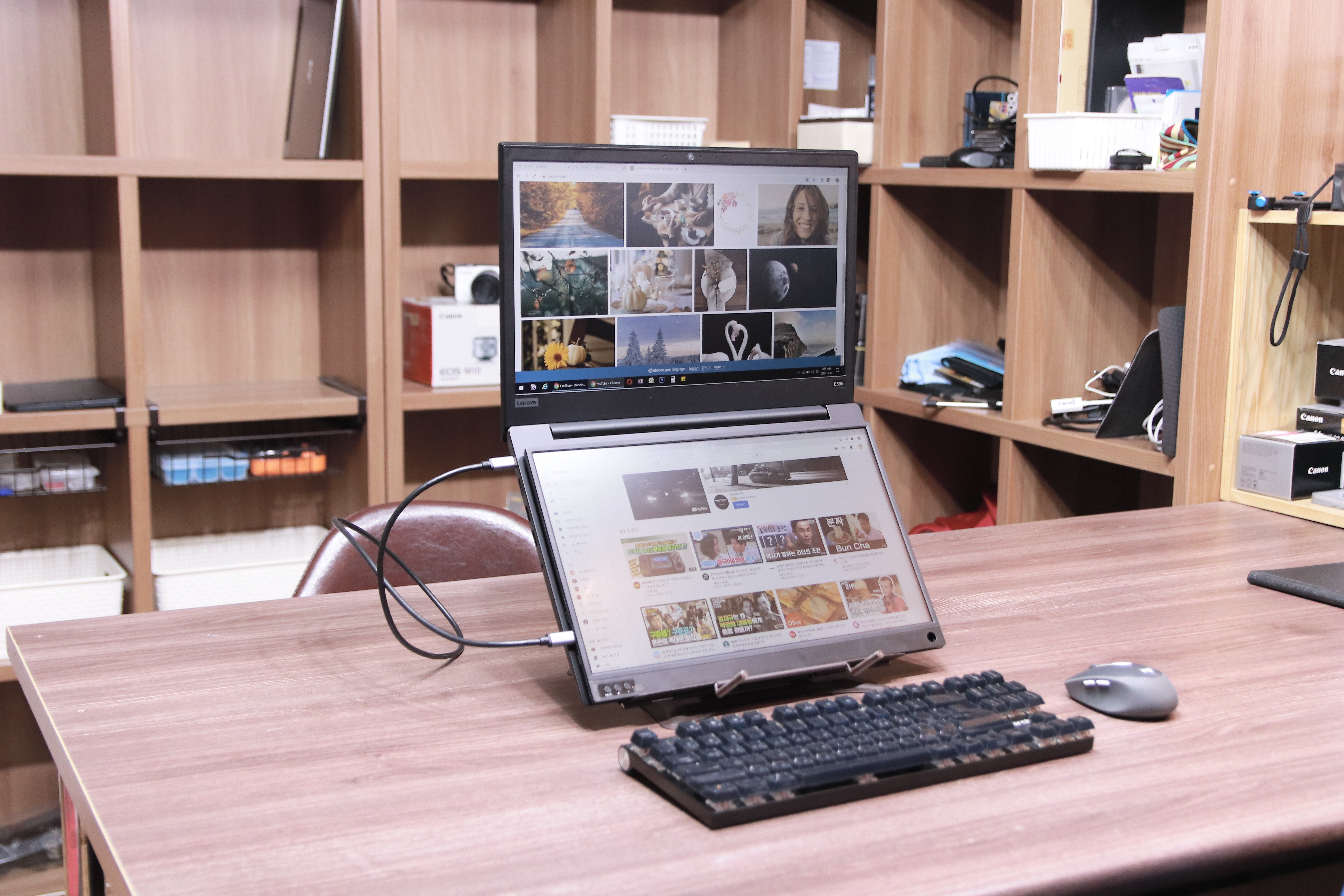 저는 예전부터 외부 작업이 많아서 다양한 휴대용 모니터를 사용해 왔는데 많이 사용 한 경험에 의한 팁을 하나 드리겠습니다. 지극히 개인적인 팁이니 참고만하세요. 보통 휴대용 모니터라고 하면 이렇게 옆에 두고 사용하는 것이 일반적이죠. 그런데 일반적인 듀얼모니터 환경도 그렇듯 사실 모니터 2개에 집중하기는 힘들어요. 고개를 좌우로 왔다 갔다 하는게 불편하죠. 그래서 말 그대로 보조모니터로 사용합니다. 노트북 모니터를 메인으로 사용하고 휴대용 모니터는 한 번씩 쳐다보는 보조용으로 쓰죠. 그런데 독서대나 노트북 거치대를 이용해서 이렇게 높게 세우고 아래에 휴대용 모니터를 위치시키면 두 모니터가 한눈에 들어오고 거북목도 해결할 수 있는 아주 좋은 환경이 됩니다. 물론 키보드와 마우스를 따로 챙겨야 한다는 단점도 있지만 제 경험상 휴대용 모니터를 가장 효율적으로 사용할 수 있는 세팅 방법이라고 생각합니다. 저는 이렇게 세팅해서 여러가지 작업은 물론 영상편집까지 합니다.