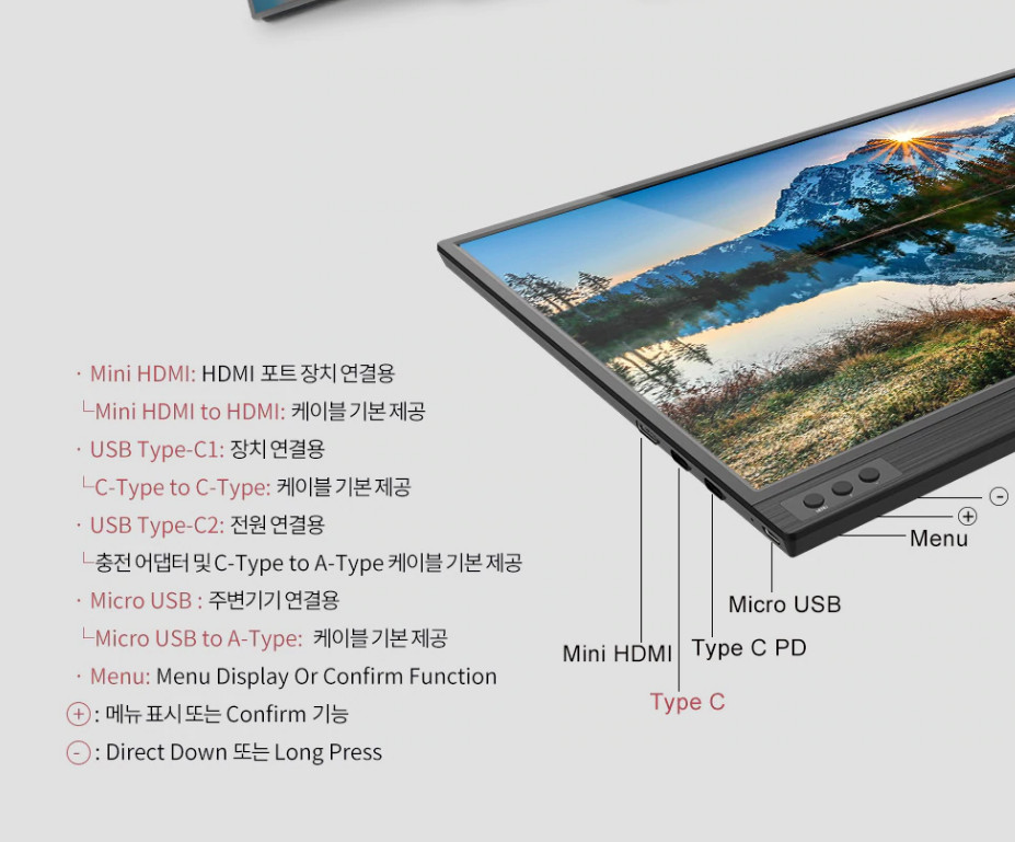 제가 이 제품을 추천하는 이유는 가성비 때문입니다. 이것보다 화질이 좋거나 더 가벼운 모델들도 물론 있지만 가격을 고려하면 당분간 이 보다 좋은 제품은 나오기 힘들어요. 그리고 가장 중요한 부분이 확장성이 너무 좋습니다. C to C를 지원하는 것은 물론 미니HDMI단자 지원하기 때문에 범용성도 좋고 전력은 마이크로5핀과 C단자 모두 지원합니다. 그리고 케이스까지 기본 구성으로 되어있죠. 제가 봤을 때 경쟁 제품과 비교하는 것이 의미가 없을 정도로 완벽한 15.6인치 휴대용 모니터 입니다.