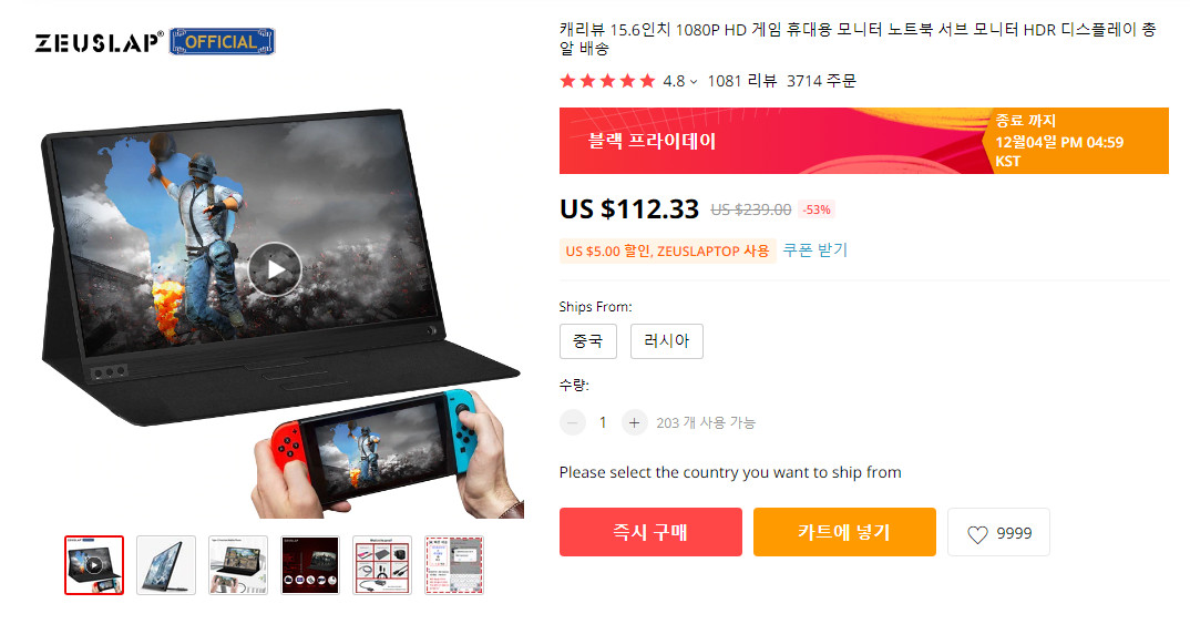 알리익스프레스에서 구매한 휴대용 모니터가 이주일 걸려서 도착했습니다. 통관번호 입력하면 일주일 안으로도 온다고 합니다. 지금 알리에서 블랙 프라이데이 행사로 112불 정도로 할인 행사하고 있는데 대략 132,000원 정도 하네요. 그런데 제가 검색해보니 국내 사이트에서도 129,000원에 판매하고 있더라고요. 물론 국내에 물건이 있는 제품이라 하루만에 배송 옵니다. 알리에서 추가 쿠폰을 사용하면 더 저렴하기도 하지만 배송을 더 빨리 받고 싶다면 국내 사이트가 좋을 듯 합니다. 구매 링크는 아래 본문에 걸어두겠습니다.