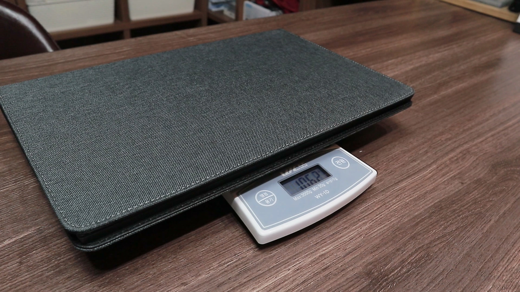 먼저 케이스 포함 무게는 1kg 정도로 LG그램 정도의 무게입니다. 케이스 뒤에 나사를 풀면 본체와 분리가 가능한데 본체의 무게는 0.66kg으로 케이스가 생각보다 꽤 묵직하네요. 배젤 얇고 두께는 슬림한 편이고 왼쪽 하단에 구멍이 있는 건 케이스 없이 거치할 때 펜같은 길쭉한 뭔가를 넣어서 거치대로 사용가능 합니다. 본체 무게가 가벼워서 이렇게 나무젓가락으로도 안전한 거치가 가능합니다.