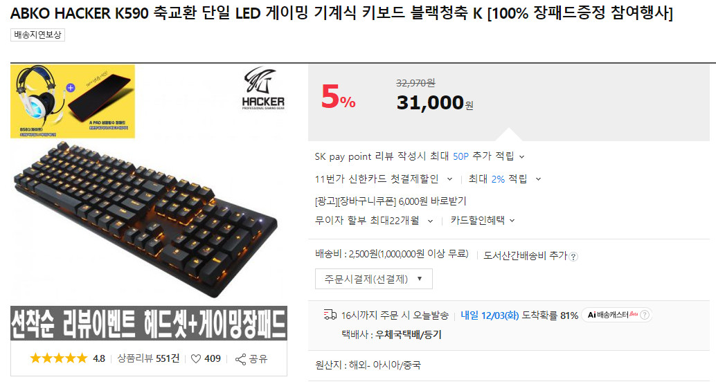 가성비 기계식 키보드인 앱코 해커 K590입니다. 총 33,500원에 결재했고, 가장 저렴한 편에 속하는 기계식 키보드입니다. 직접 사용해보니 생각보다 무난하다는 느낌이 들지만 치명적인 단점이 있기 때문에 추천 드리기는 힘든 부분이 있습니다.