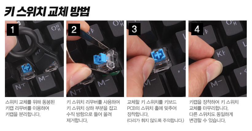 그리고 이 제품이 강조하고 있는 기능 중 하나가 축교환이 가능하다는 점인데, 물론 안되는 것 보다 되는게 당연히 좋죠. 하지만 축교환 하고 제대로 사용하려면 이 본체로는 안됩니다. 축교환 하려면 더 좋은 기계식 키보드 사셔야 돼요. 여기에다가 축교환이 무슨 의미가 있나 그런 생각이 드네요.