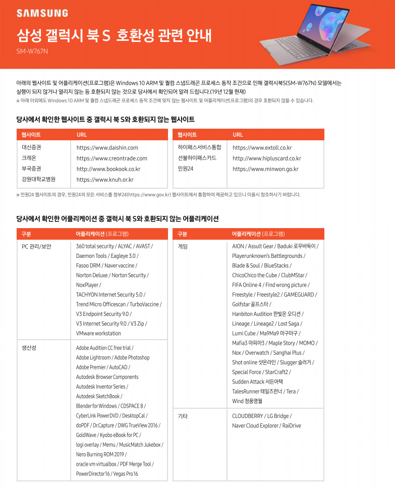일반적인 윈도우 사용자가 사용하기에 호환성 문제를 절대 무시 못합니다. 단순하게 이것만 피하면 되겠지가 아닌 여기 나와있는 정보는 시작에 불과합니다. 호환성이라는 건 사용하다 한번만 부딪혀도 바로 후회하게 됩니다. 그런데 한번만 부딪힐까요? 호환성 문제는 수도 없이 생기겠죠. 그렇게 때문에 결국 내가 노트북에 맞춰서 사용해야 돼요.