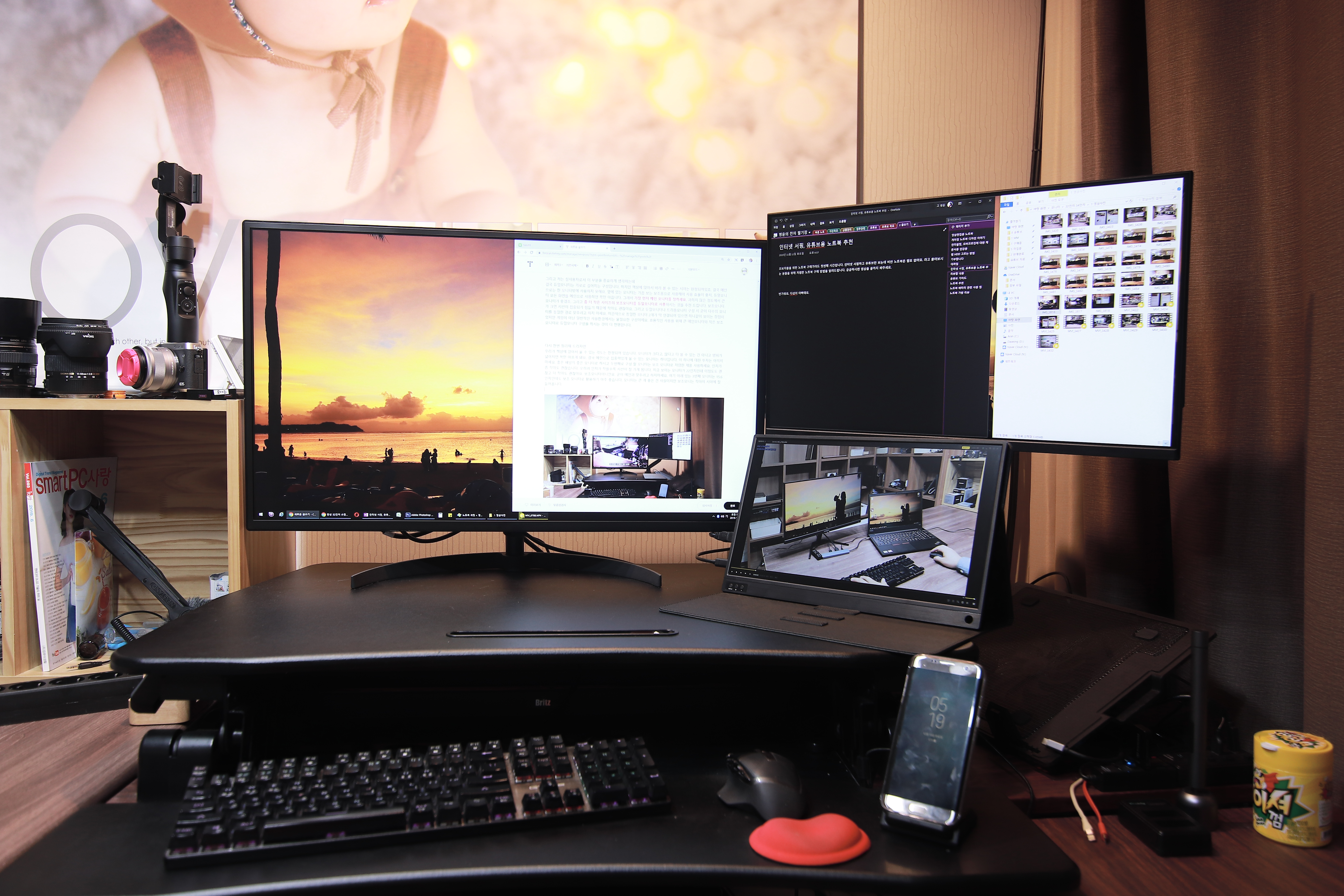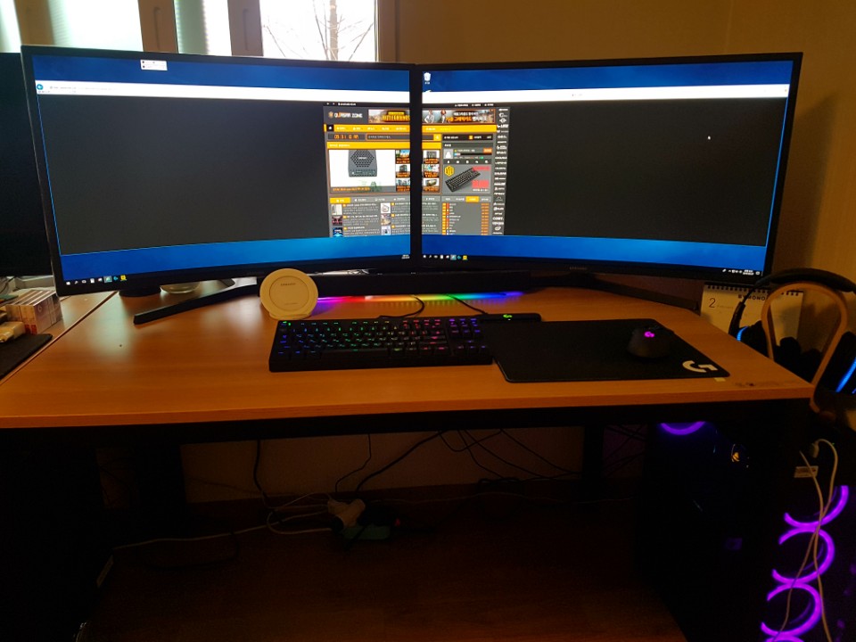 인터넷에 올라온 잘 세팅 된 듀얼모니터 구성의 사진들은 대부분 일반 책상 사용하지 않고 굉장히 큰 대형 책상을 사용하죠. 이미 모니터도 모니터지만 책상에 대한 투자도 들어간 상태에서 이런 세팅이 가능합니다. 일반적인 책상으로는 한계가 있어요. 그리고 당연히 대형 책상이 들어 갈 공간도 필요로 하죠.