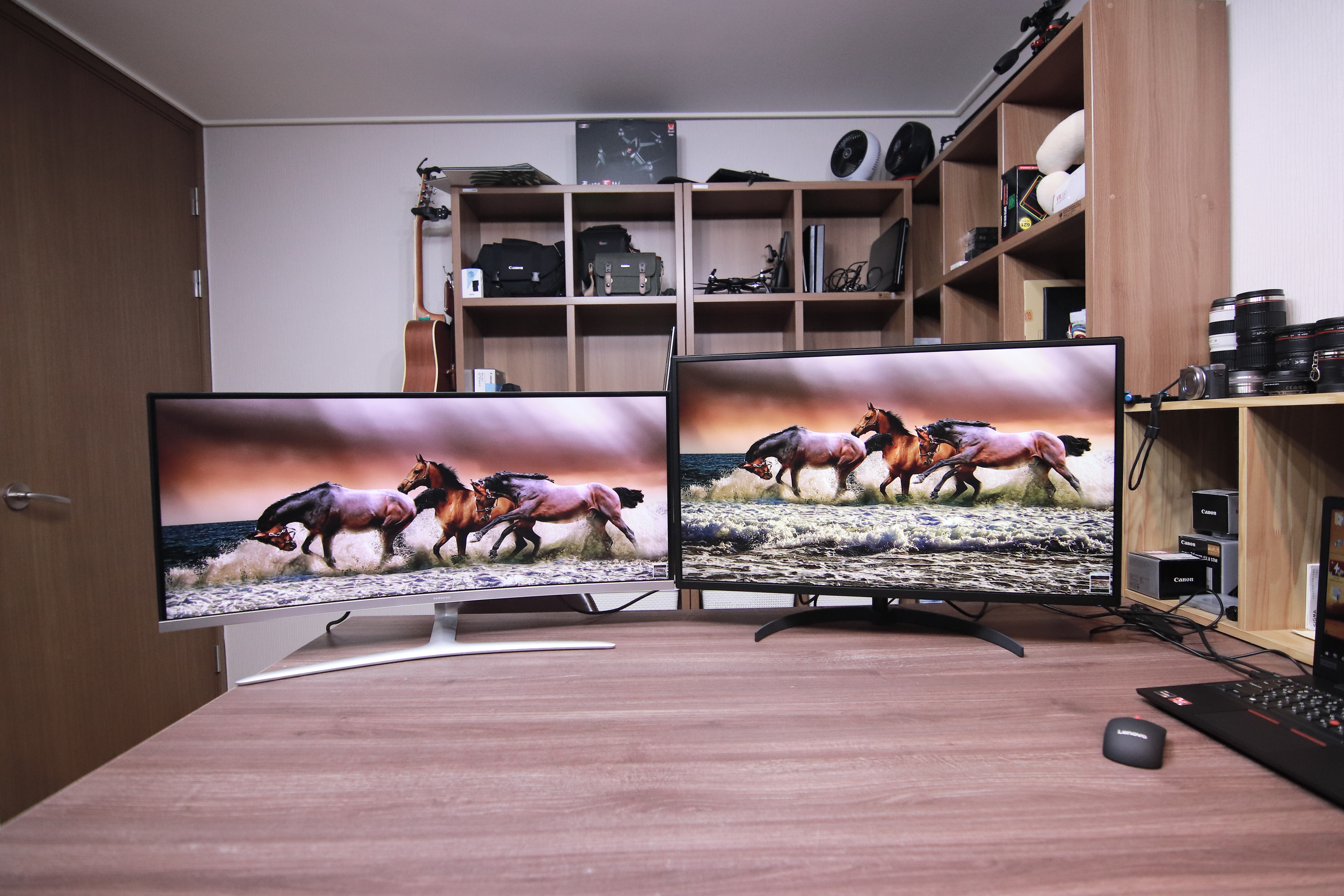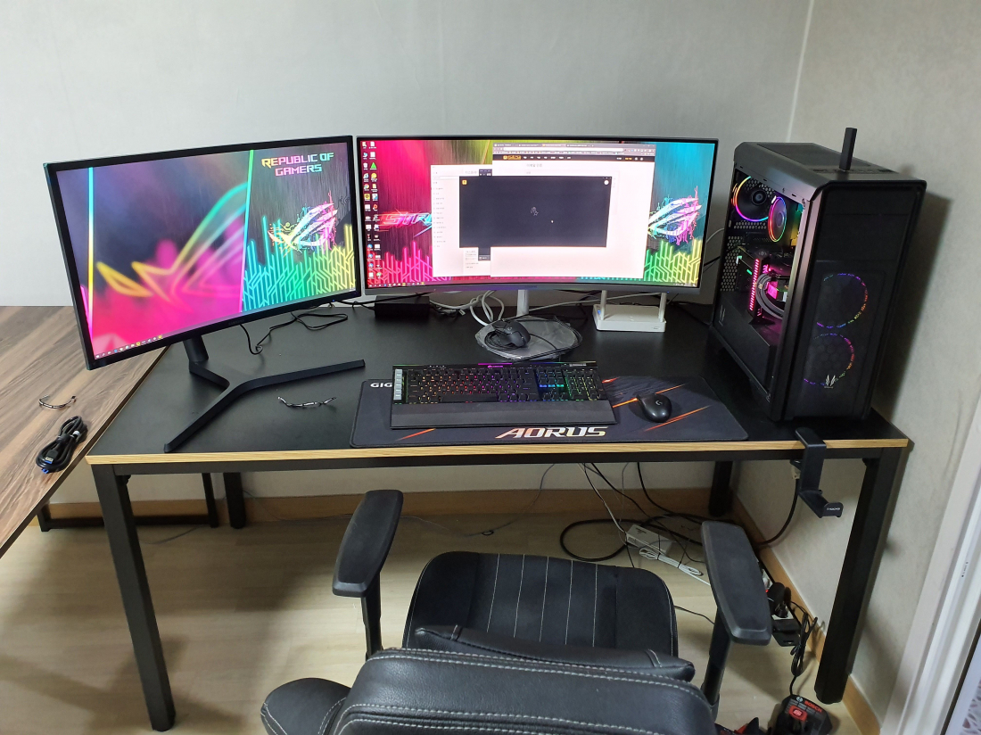 예를 들어 32인치 34인치 이런 큰 모니터를 가지고 듀얼모니터를 구성하려고 하면 공간을 확보하고 책상부터 바꾸셔야 돼요. 지금 보이는 32인치와 34인치르 일자로 뒀을 때 가로 길이만 170cm가 나옵니다. 일반 책상으로는 안되죠. 그러면 이게 결국 대형 듀얼모니터를 구성하기 위해서는 모니터에 대한 투자 이외 책상에 대한 투자도 필요하다는 거죠.