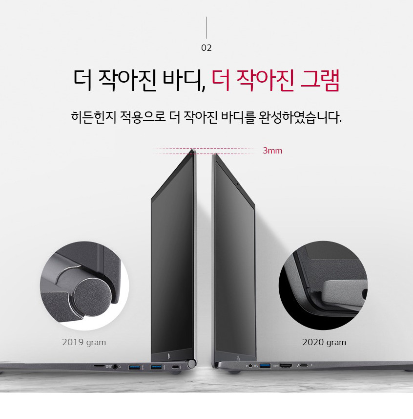 2019 그램을 보면서 정말 더 이상 줄어들 곳이 없겠다 라고 생각했는데 힌지를 숨겨서 3mm를 더 줄였습니다. 고작 3mm가지고? 라는 생각할 수 있겠지만, 예를 들어 태평양 배젤의 울트라PC를 3mm줄인건 칭찬할 필요가 없습니다. 제가 사포로 노트북을 갈아도 3mm 줄일 수 있어요. 하지만 이미 초경량으로 줄일만큼 줄인 노트북들은 1mm, 1mm 들어갈 때 마다 엄청난 개발비와 노력이 들어갑니다. 비록 3mm로 절대 티도 안나는 정도이지만 사이즈를 줄이려는 노력을 한 부분은 칭찬해야 합니다. 참고로 이 히든힌지는 구조상 180도 오픈이 되지 않고 각도의 제한이 있습니다. 이정도가 최대각인 듯 합니다.