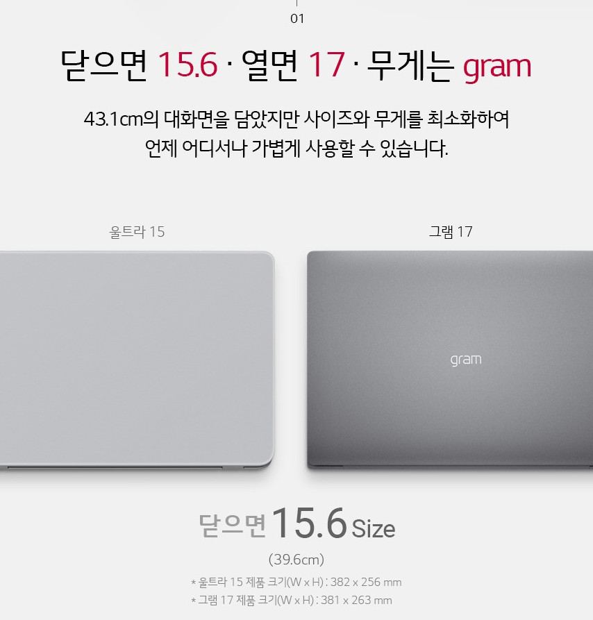 2019년 그램17도 그렇고 저는 이 광고 볼 때마다 정말 어이가 없어요. 그램17의 사이즈야 뭐 세계 최고의 기술력인거 다 아는 사실인데 지들이 만들어 놓은 태평양 배젤의 울트라15을 굳~이 옆에 두고 비교한다는게 좀 꼴뵈기 싫어요. 실제로 그램17은 울트라15처럼 경량화 되지 않은 15.6인치 노트북과 크기가 비슷합니다. 그램17이 가로만 좀 더 길어요.