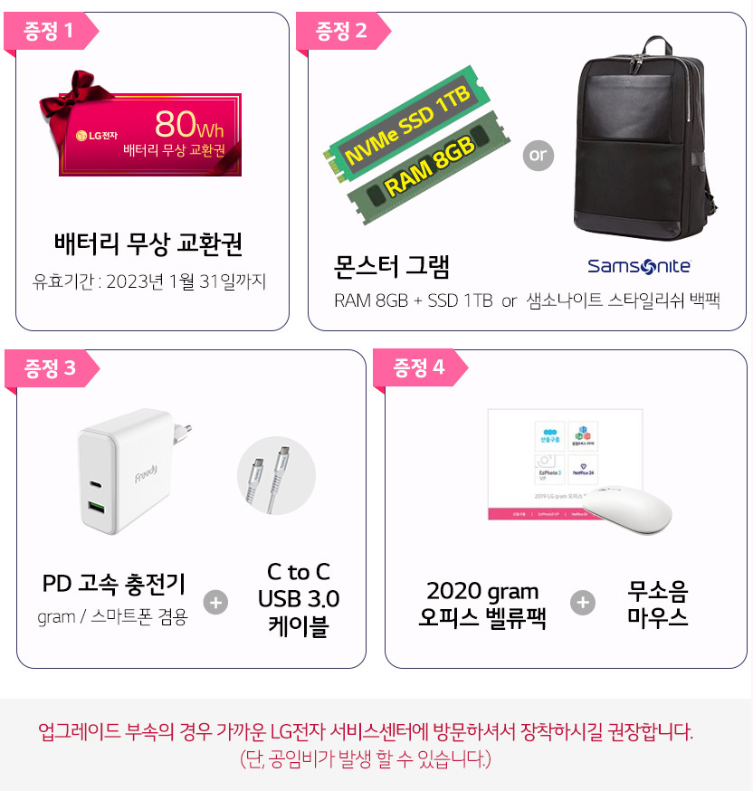 저는 모든 리뷰에서 말씀드리지만 예약판매는 좋지 않다고 생각합니다. 예약판매 가격은 그 노트북의 최고가로 보시면 됩니다. 정식판매 시작과 동시에 온라인 최저가가 계속 내려갈 텐데 굳이 최고가로 구매 할 필요가 없다고 생각합니다. 그런데 사은품이 꽤 괜찮습니다. 3, 4번은 무시해도 되고, 1, 2번이 꽤 괜찮네요. 사용자마다 다르겠지만 배터리 웨어율은 보통 2년 지나고부터 60% 아래로 내려가고, 휴대용하기 불편해 지거든요. 그 시점에 맞춰서 무상 교환을 해줍니다. 2019년 그램의 72Wh 배터리 교체비용이 92,000원인 것을 고려하면 좋은 사은품이라 생각합니다. 아마도 교환권의 실제 사용되는 비율이 낮을 것으로 LG에서 미리 예측하고 무상 교환권을 뿌렸겠죠. 그리고 RAM 8GB와 SSD 1TB도 증정합니다. 나름 파격적인 사은품은 맞지만 노트북 가격을 생각하면 이정도는 줘야한다고 생각합니다. 램과 SSD의 공임비는 별도입니다. 참고하세요.