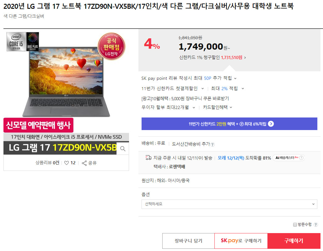 2020년 그램17이 예약판매를 시작하고 있습니다. 먼저 가격은 윈도우10 미포함 기준 i5 166만원, i7 187만원입니다.