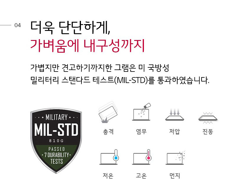 LG그램 경량 기술의 핵심, 마그네슘합금바디입니다. 가벼우면서도 강도가 강한 신소재라고 생각하시면 되고 노트북이 사용할 수 있는 가장 고급의 외형 재질입니다. 좋은 바디로 인해 밀스펙도 통과했습니다. 참고로 아셔야 할 부분이 아무리 밀스펙을 통과해도 유리액정은 유리액정입니다. 디스플레이 무게를 최소화 하기 위해 액정을 강하게 만들지 못해요. 액정은 여전히 잘 깨집니다. 밀스펙 믿고 막 사용하지 마세요. 노트북은 멀쩡할 수 있어요. 액정이 깨지죠.