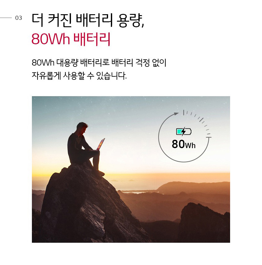전작인 72Wh도 굉장히 큰 배터리인데 80Wh가 들어갔습니다. 단순히 배터리를 늘리는 것은 쉬워요. 그냥 공간 확보해서 배터리 넣으면 되거든요. 그런데 원가는 물론 무게가 증가합니다. 7Wh 정도의 배터리를 늘렸는데도 불구하고 전작과 거의 동일한 무게입니다. 이게 바로 세계 최고의 노트북 경량 기술입니다. 그램이 가격과 발열 때문에 까이긴 해도 이 경량 기술은 정말 인정해야합니다. 배터리 타임은 10세대 CPU의 전력사용량이 가장 중요하고 결과적으로는 좀 더 증가 했을 거라 생각합니다.