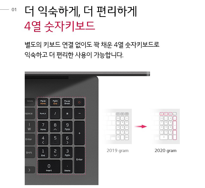 백라이트 키보드와 지문인식은 언급할 내용이 없고 4열 숫자키보드는 언급이 필요합니다. 보통 노트북 풀사이즈 키보드는에 달려있는 숫자패드는 3열과 4열로 나뉩니다. 우리가 생각하는 일반적인 데스크탑 키보드는 당연히 4열이죠. 그렇기 때문에 사용해보면 4열이 확실히 편하고 오타율이 적습니다. 3열은 엔터와 숫자0의 위치때문에 오타가 생깁니다. 근데 이게 사용자분들은 아시겠지만 절대 익숙해지지 않아요. 계속 오타납니다. 그 이유가 우리 손이 3열 숫자패드에 익숙할 때 쯤 데스크탑을 써버리니깐 이 3열에 익숙해지지가 않는 거죠. 하지만 2019년 그램도 그렇고 제가 최근에 리뷰한 비보북도 그렇고 3열을 고집하는 노트북들이 있습니다. 그 이유가 타이핑 포지션을 최대한 중앙으로 하기 위해서죠. 그렇게 안정적인 타이핑 포지션을 가지고 있어야 내 시선이 정확히 노트북 디스플레이의 중앙을 향하게 되고 그 결과 집중력 높은 노트북 사용이 가능합니다. 하지만 이렇게 4열로 되면 타이핑 포지션이 왼쪽으로 살짝 더 가게 되죠. 지금 제가 말하는 부분을 별거 아닌거 가지고 오바하지마라 고 생각할 수 있겠지만 이런 아주 미세한 인체공학적인 부분까지도 노트북의 개발 영역입니다. 그래서 저는 3열 숫자패드를 선호하지만 이번 2020그램은 대중성을 선택했고 아쉽게도 4열의 숫자패드로 변경되었습니다. 저 같은 소수의 유저들만 아쉽고 대부분의 사용자들이 반기는 변화입니다.