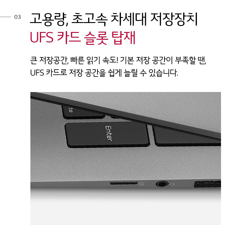 포트는 전작과 큰 차이 없으며 UFS지원이 추가되었습니다. 삼성 노트북은 이 전 모델부터 적용시켰는데 쉽게 말해서 속도가 빠르고 안정적이고 굉장히 비싼 마이크로SD카드 라고 할 수 있습니다. 차세대 모바일 스토리지라고 하는데 2년 전부터 차세대였고, 지금도 차세대입니다. 정말 사용하는 사람 한 명도 못 봤습니다. 그런데 만약 하나 있으면 부피도 작고 속도도 빠르고 하니 노트북에 넣고 외장 디스크처럼 사용하면 편리할거 같긴 하더라고요. 앞으로는 저도 노트북에 사용을 해 볼 예정입니다.