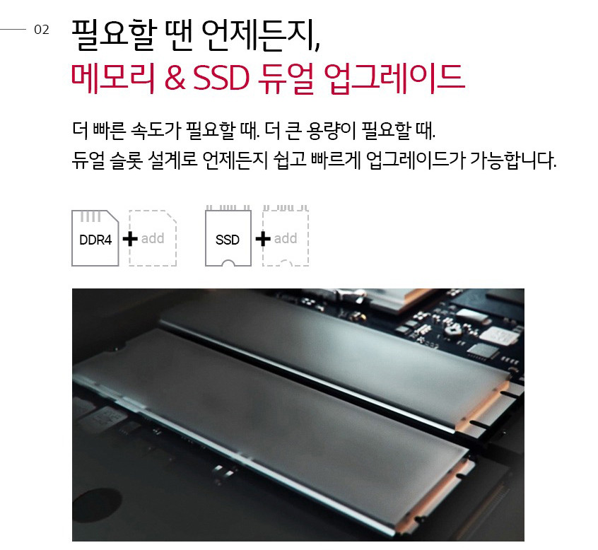 기본 NVMe 256GB에 전작과 동일하게 M.2 규격의 추가 슬롯 지원합니다.