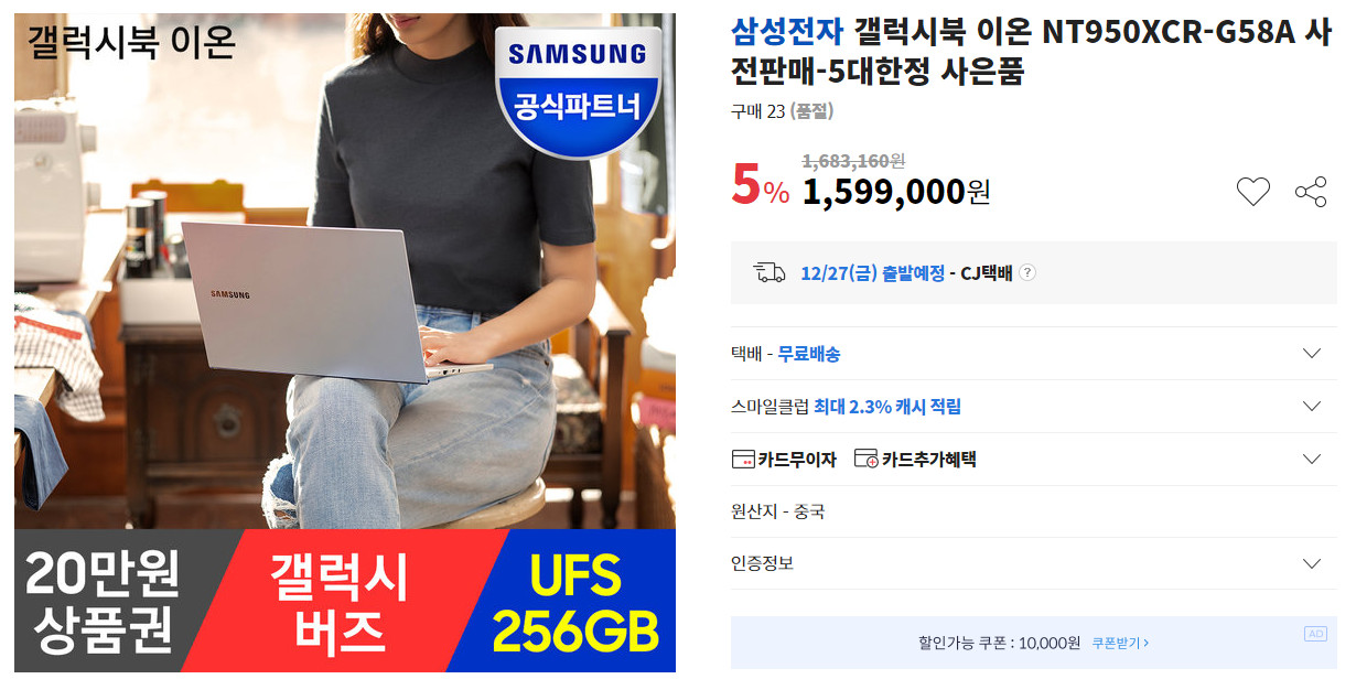 예판 가격은 160만원으로 당연히 높게 책정되었습니다. 그런데 사은품이 또 장난 아니네요. 사은품 마케팅 대단합니다. 일단 신세계 모바일 상품권 20만원은 현금 20만원의 가치와 큰 차이 없습니다. 갤럭시버즈 대충 한 10만원 정도라하고 UFS 256GB도 한 10만원 초중반 합니다. LG그램 보다 사은품 더 잘 주는 거 같네요. 이게 그냥 주는게 아니고 별5개 달아서 포토상품평 만들고, 블로그에 홍보하고 그래야 주는 사은품입니다. 대충 계산해도 40만원인데 당연히 장점 위주로 후기를 남기죠. 그럼 일단 이 제품의 리뷰는 온라인 검색 시 장점으로 도배가 됩니다. 이게 대기업 마케팅의 힘이고 자본금의 힘이에요. 한편으로는 이게 노트북 시장의 현실이죠.