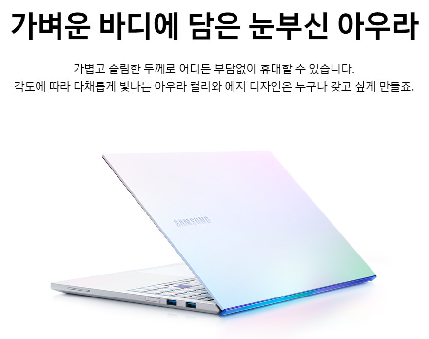 색상은 노트10에 적용되었던 아우라실버입니다. 빛 반사에 따라 색상이 오묘하게 변하고 갤럭시북 이온의 미래지향적인 디자인과 잘 어울린다고 생각합니다. 하지만 어두운 계열의 색상이 없다는 건 다소 아쉽네요.