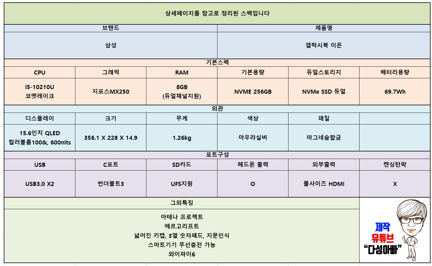 제가 상세페이지를 통해 분석할 수 있는 정보는 이까지 입니다. 제공되는 사진만 많았어도 더 많은 분석이 가능할 텐데 아쉬움이 있습니다. 삼성 노트북을 이렇게 신나게 분석한 건 오래간만이네요. 디자인과 스펙과 기능이 잘 어우러져 잘 만들어진 노트북이라고 생각합니다. 물론 가격은 아닙니다.