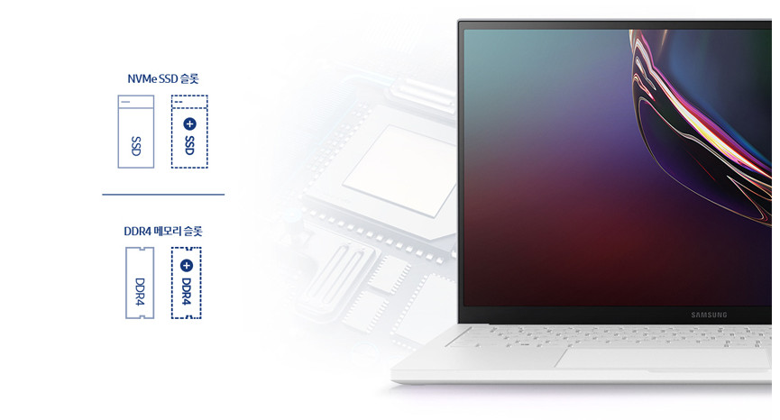 램8GB에 NVMe 256GB 기본 탑재 되어있고, 둘 다 추가 업그레이드 가능합니다.