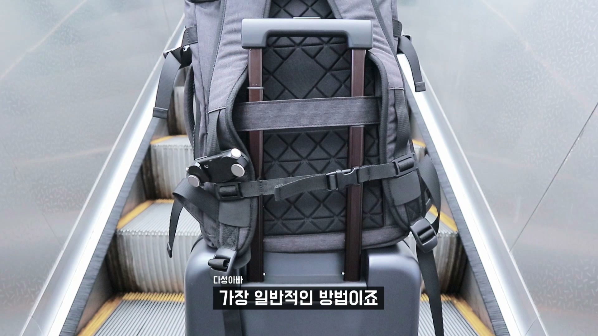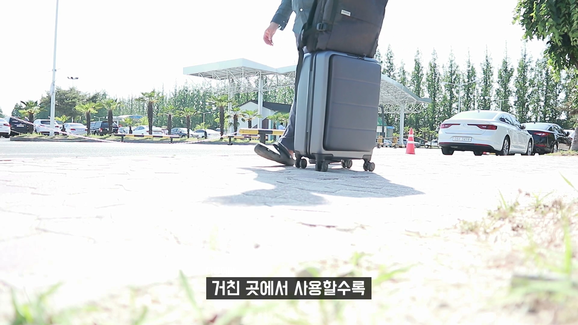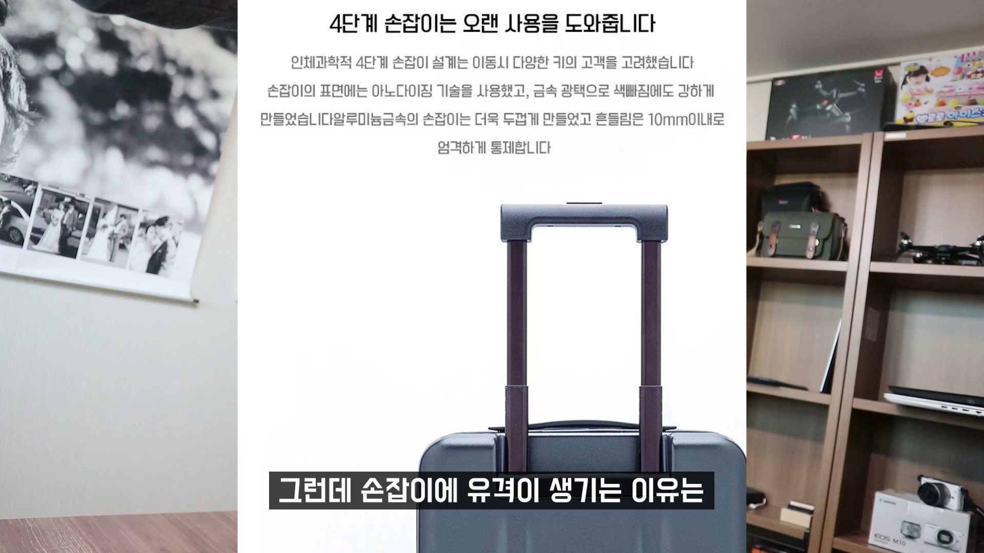 특히 기울여서 이렇게 다니면 캐리어의 무게 하중 때문에 당연히 손잡이에 유격이 더 심하게 생깁니다. 최대한 손잡이를 짧게 사용 하면 오래 사용해도 유격이 생기지 않습니다.