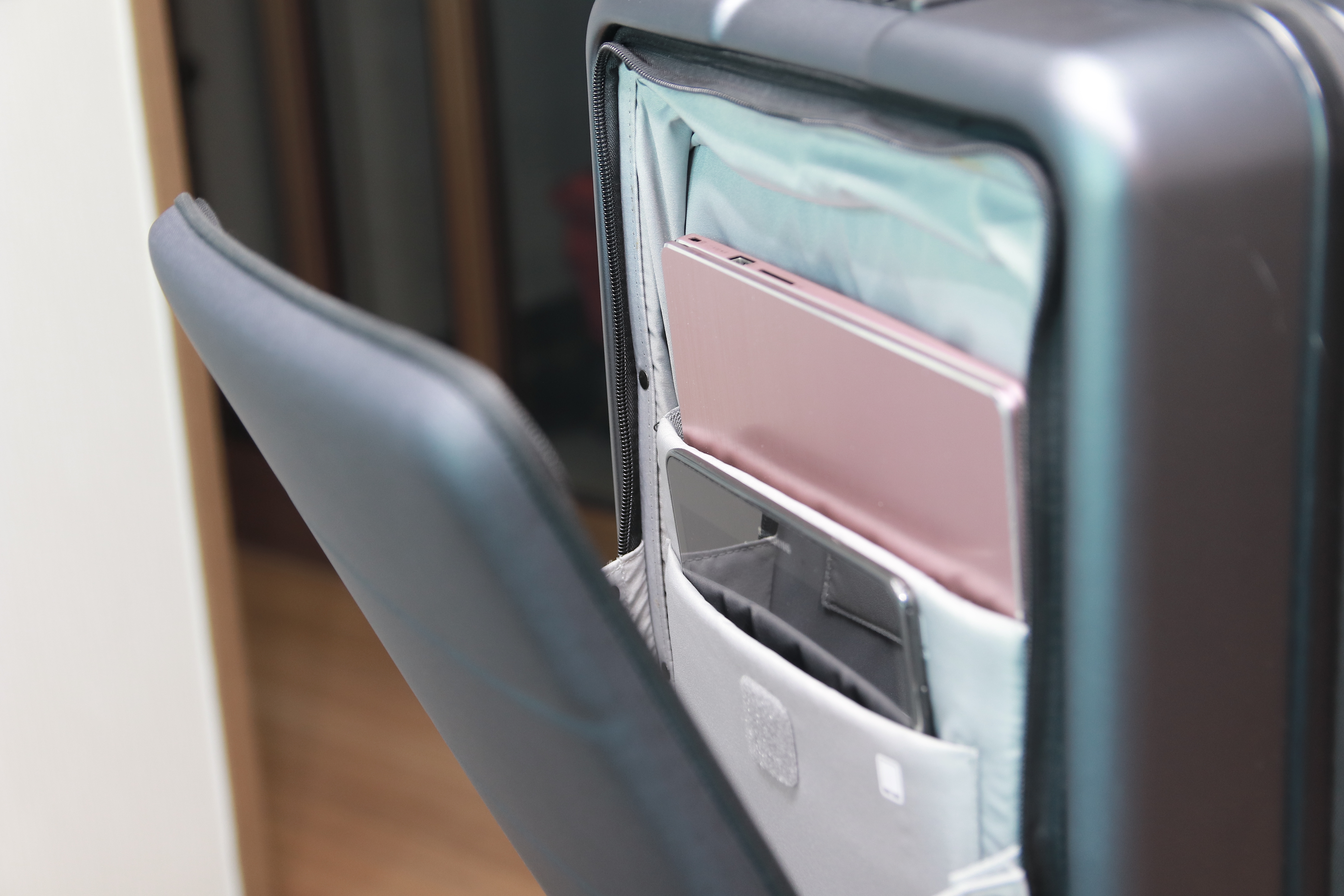 캐리어 확장이 안되는 제품인 것을 알고 구매 했음에도 불구하고 좁아도 너무 좁아요. 이게 너무 큰 단점이죠. 그 이유가 내부 공간이 확보 된 상태에서 노트북을 넣는 것이 아닌 노트북을 넣고 태블릿을 넣고 지갑을 넣은 부피만큼 내부공간이 줄어든다는 거죠. 저는 이 캐리어를 사용함에 있어서 이 부분이 가장 큰 단점으로 다가오더라고요.