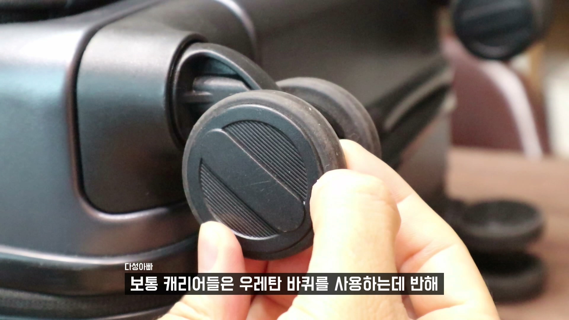 보통 캐리어들은 우레탄 바퀴를 사용하는데 반해 고무의 느낌이 강한 소재의 사용으로 제가 가지고 있는 어떠한 캐리어 보다 소음이 적습니다. 하지만 재질에 연성이 있다는 건 그 만큼 마모도 빨리 된다는 의미입니다. 우레탄 바퀴 대비 수명이 짧다는 의미이고, 거친 곳에서 사용할수록 마모가 빨리 진행 될 것으로 예상됩니다. 회전할 때의 느낌은 특별히 더 좋지는 않고 보통의 캐리어와 동일합니다. 하지만 바퀴 재질때문에 부드럽다고 느껴지는 부분은 확실히 있습니다.