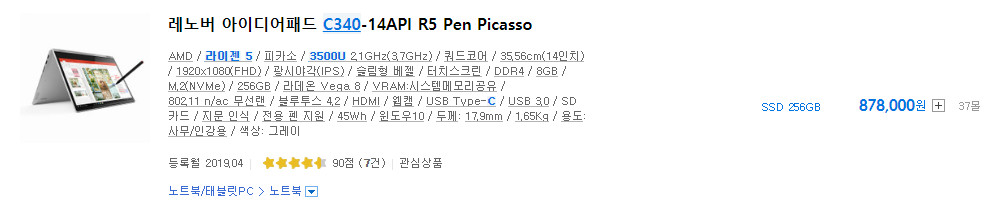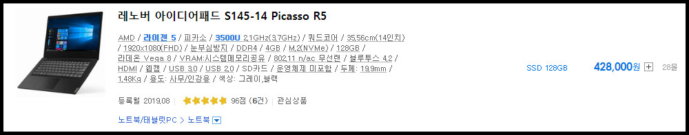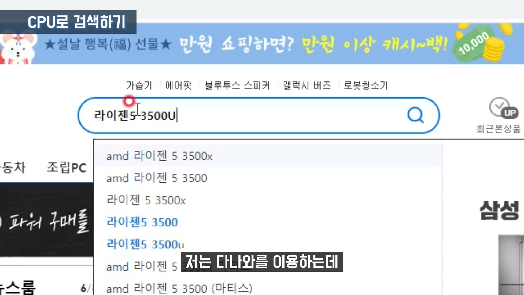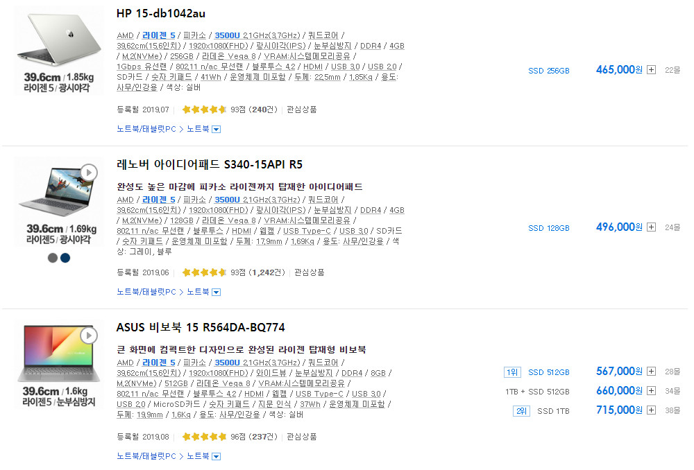 제가 최근에 레노버 아이디어패드 S340 라이젠5 모델을 추천했습니다. 제 리뷰를 보시고 이 제품의 성능과 사용 범위가 맘에 든다면 이 제품명을 검색하지 마시고, 이 제품의 CPU를 검색하세요. 같은 CPU를 사용하는 노트북들은 성능과 사용범위가 동일하다고 봐도 무방합니다. 제가 추천한 노트북의 CPU는 "라이젠5 3500U"이고 오픈마켓에서 이 CPU명을 검색하시면 됩니다. 저는 다나와를 이용하는데 네이버쇼핑 포함 모든 오픈마켓이 모두 동일하니, 본인이 잘 사용하는 오픈마켓에서 검색하시면 됩니다.