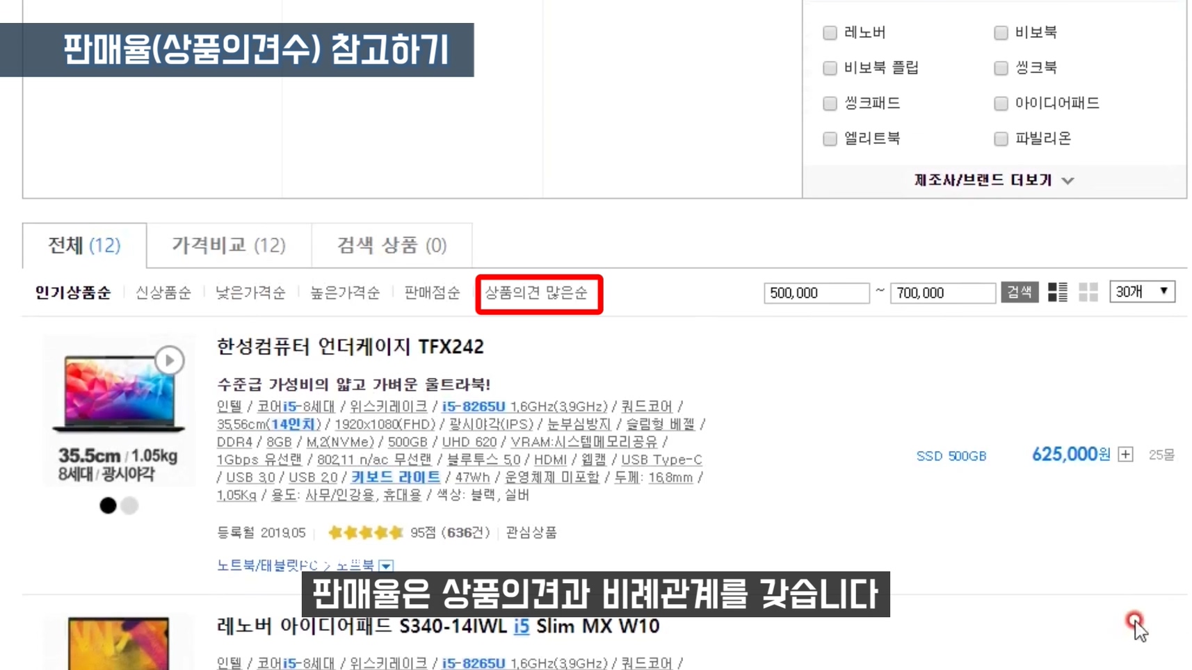 노트북의 좋고 나쁨이 판매율과 100% 연관되지는 않지만 그럼에도 판매율이라는 부분은 절대 무시할 수 없는 부분이죠. 다나와 기준 판매율까지는 알 수 없지만, 판매율은 상품의견과 비례관계를 갖습니다. 당연히 판매율이 높으면 상품의견이 많을 수 밖에 없어요. 여기 "상품의견 많은순"을 눌려주면 대략적인 판매율 순서로 보실 수 있습니다. 이 CPU제품에서는 이 제품이 인기가 많구나 라고 대략 예측이 가능하죠. 그리고 상품을 누르고 들어가면 실제 상품의견도 직접 보실 수 있습니다.