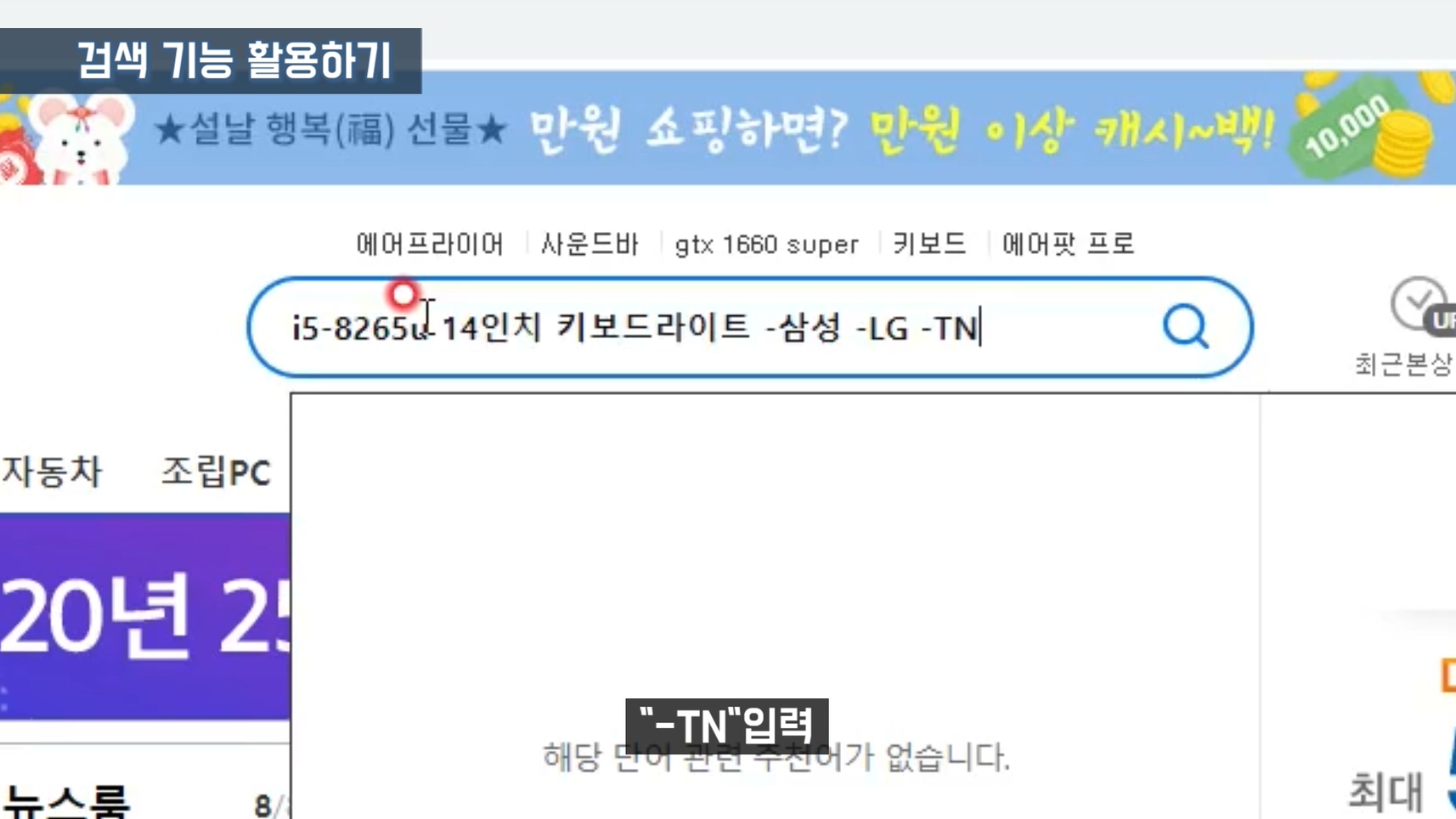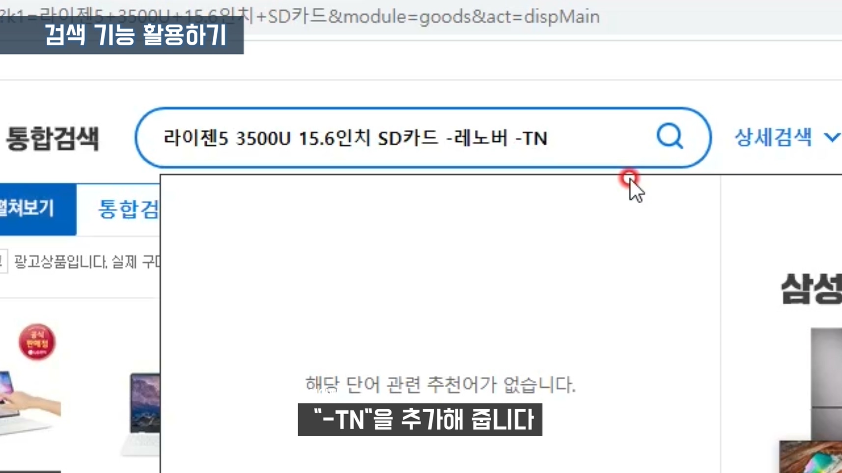 그리고 "검색제외"라는 기능도 굉장히 편리한데 검색어 앞에 "마이너스"기호를 넣으면 이 뒤에 오는 검색어는 검색 결과에 나오지 않습니다. 예를 들어 레노버를 별로 좋아하지 않는다면 "-레노버"를 검색어에 추가하면 되고, TN패널은 구매하지 않을 것이 좋으니 "-TN"을 추가해 줍니다. 이렇게 검색하면 좀 더 나에게 맞는 노트북을 쉽게 찾을 수 있어요.
