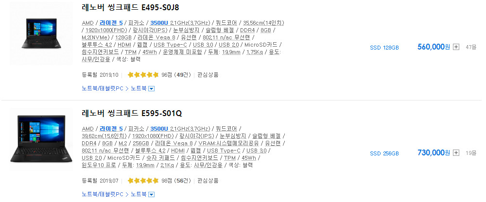 싱크패드 같은 경우는 일반적인 보급형 노트북 대비 항상 10만원 이상 정도가 비싼 편인데 PD충전을 지원하고 크기는 좀 클 수 있지만 내부가 굉장히 견고합니다. 빌드 퀄리티 자체가 상당히 좋아요. 이렇듯 같은 CPU를 사용해도 그 노트북의 옵션이나 기능 그리고 빌드 퀄리티에 따라 가격이 다양하다 라는 것을 아시면 좋고 그럼에도 불구하고 가격대비 성능, 즉 가성비는 저렴한 제품이 가장 좋습니다.