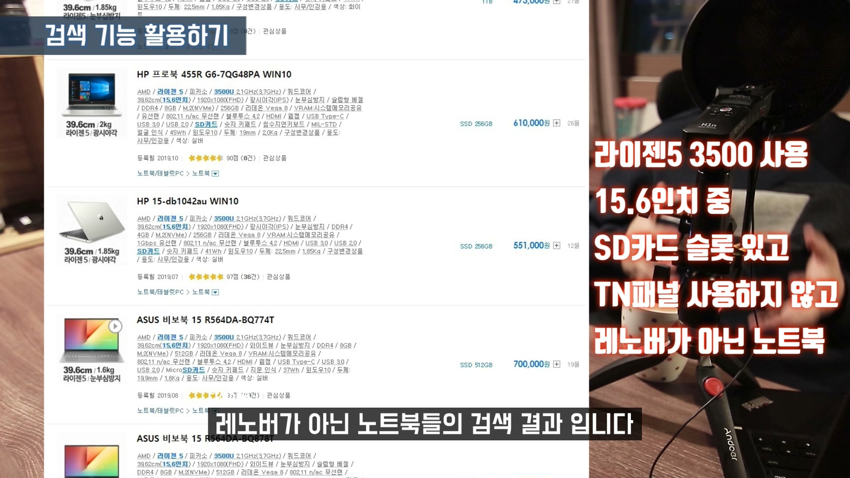 지금 보이는 이 검색의 결과는 라이젠5 3500U를 사용하는 15.6인치 노트북 중 SD카드있고 TN패널을 사용하지 않고 레노버가 아닌 노트북들의 검색 결과 입니다.그리고 여기서 가격대도 설정할 수 있지만 검색 결과가 한눈에 보이는 정도라면 가격 설정은 굳이 안 하셔도 됩니다.
