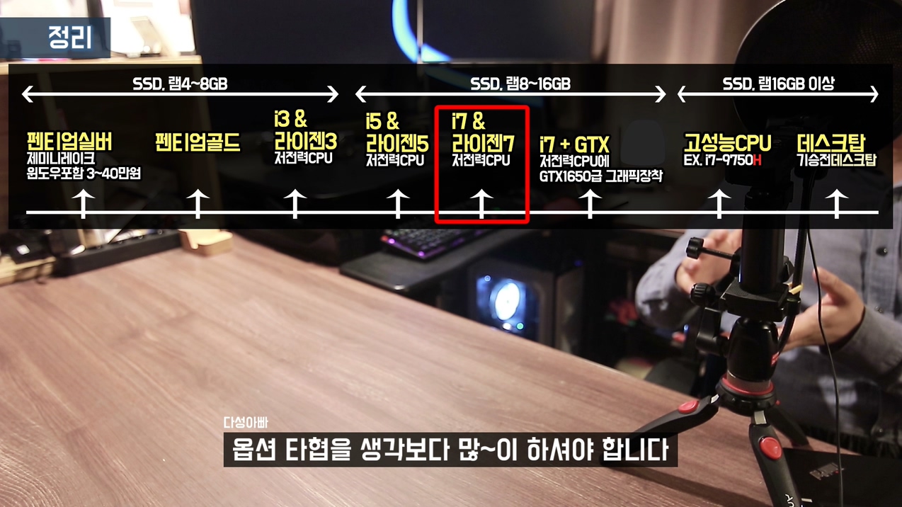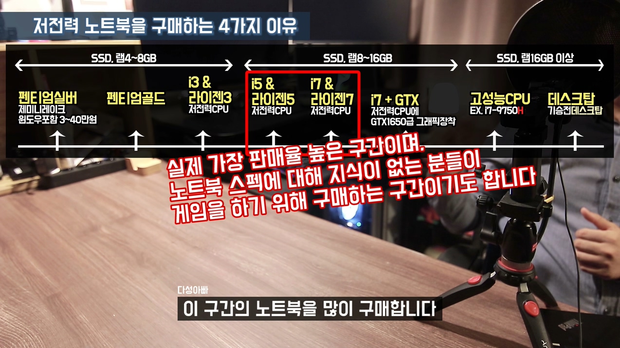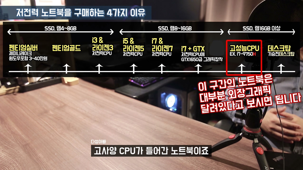 제가 유튜브하면서 가장 많이 받는 질문 중 하나가 "인터넷 서핑하고 인강들을 가벼운 노트북 추천해주세요. 그런데 오버워치 가끔씩 합니다." 이런 질문들인데, 상식적으로 생각해보세요. 게임을 가끔씩 한다고 해서 게임의 사양이 낮아지는 건 아니죠. "게임은 가끔 하기 때문에 옵션을 많이 낮춰도 괜찮습니다" 라고 말씀하시면 저전력 i5, i7의 노트북들도 괜찮지만 이런 관대한 마음이 없는 상태에서 저전력CPU를 구매하면 만족 할 만큼의 퍼포먼스가 나오지 않습니다.