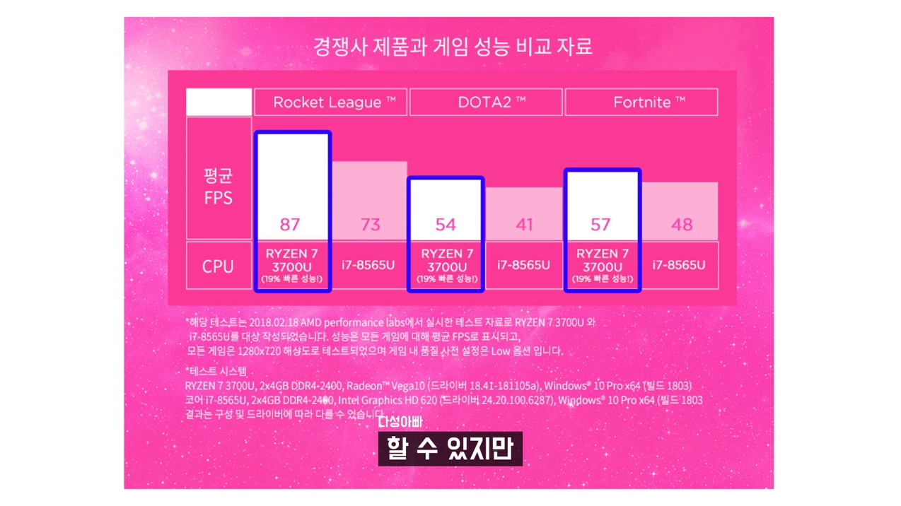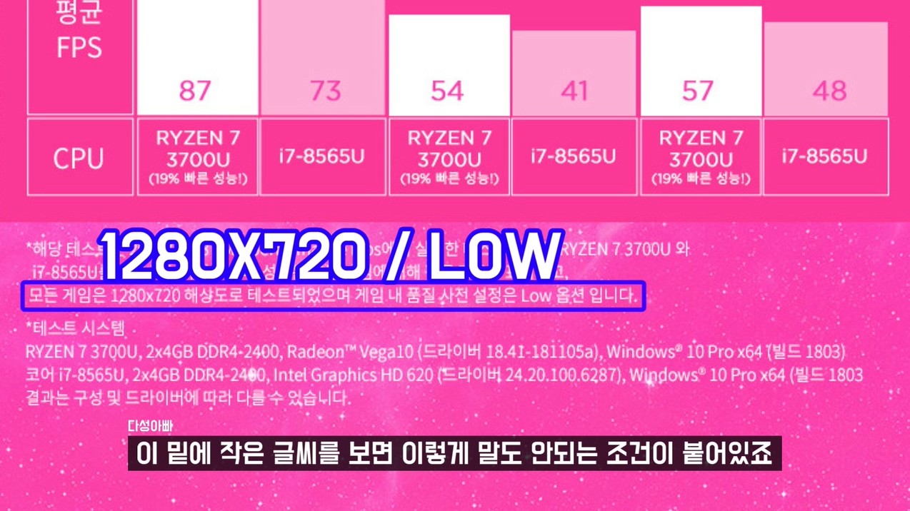 지금 나오고 있는 아이스레이크 제품을 제외하고 저전력CPU 중에서 내장 그래픽 성능이 가장 좋다고 평가되는 라이젠7 3700U의 노트북 광고를 보면 이렇게 표시하고 있습니다. 이것만 보면 라이젠7으로 게임을 할 때 초당 프레임이 꽤 잘 나오구나 할 수 있지만 이 밑에 작은 글씨를 보면 이렇게 말도 안되는 조건이 붙어있죠. 새 노트북을 구매 하면서 이 조건으로 게임 플레이 하고싶은 사람이 얼마나 되겠어요. 이 그래프는 제조사에서 원하는 결과를 위해 만들어지 자료라고 보시면 되고 당연히 객관성이 떨어지죠. 이 조건을 작은 글씨로 넣은 건 정말 치사한 꼼수입니다. 그런데 초보자들은 이런 꼼수에 잘 넘어가요. 이 구간에 있는 노트북 광고를 보면 이런 그래프들을 많이 보실 수 있습니다. 인텔 계열보다 내장그래픽 성능이 좋은 AMD 계열의 노트북들의 광고에서 더 많이 보이는 듯 합니다. 물론 이 정도로 옵션을 낮추면 게임 플레이는 가능합니다. 하지만 그렇게 플레이 한다 해도 발열 문제에서 자유롭지는 못합니다.